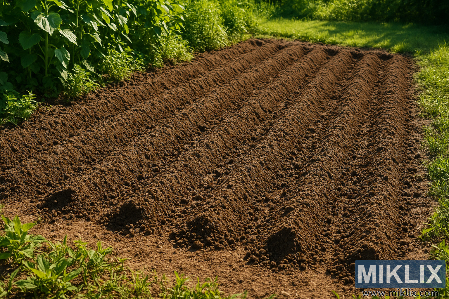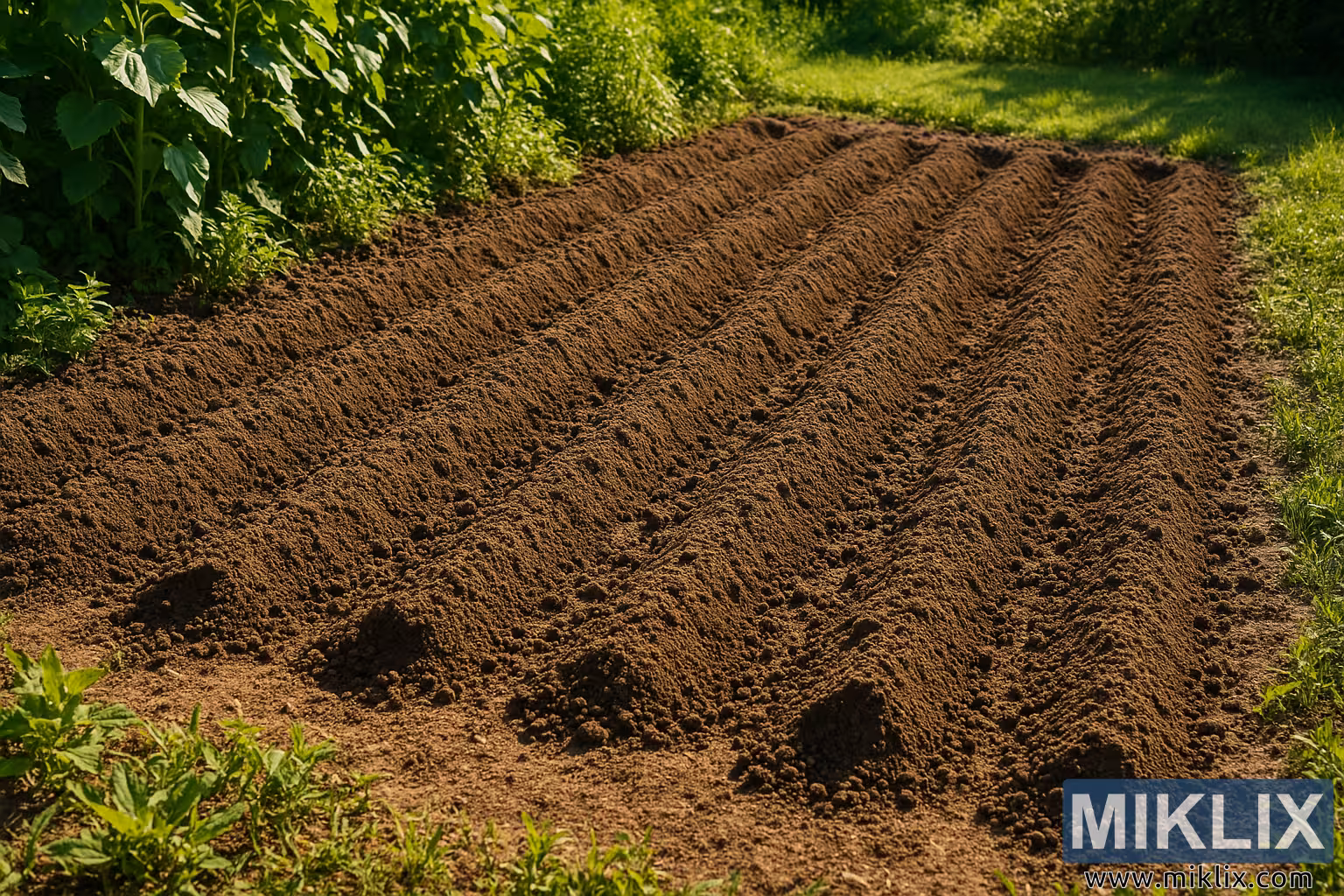 Bedengan taman itu sendiri menjadi pusat perhatian, membentang diagonal melintasi bingkai dalam barisan tanam yang rapi dan berjarak sama. Tanahnya tampak kaya, gelap, dan baru diolah — cukup gembur sehingga akar bunga matahari muda dapat tumbuh dengan mudah sekaligus mempertahankan struktur yang cukup untuk retensi kelembapan dan aerasi. Teksturnya yang halus dan gembur menunjukkan bahwa tanah telah dipersiapkan dengan baik, kemungkinan diperkaya dengan bahan organik atau kompos untuk memastikan fondasi yang kaya nutrisi. Tonjolan dan alur halus terlihat di antara barisan, membantu meningkatkan drainase dan mencegah genangan air di sekitar benih atau tanaman muda setelah ditanam.