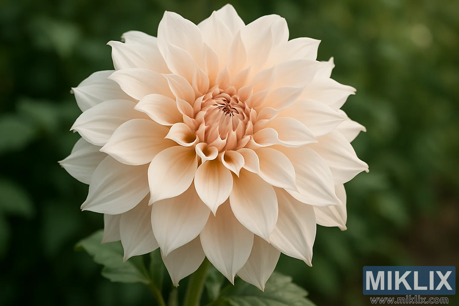 Gambar ini menampilkan close-up yang memukau dari satu bunga dahlia Café au Lait yang mekar sempurna, disajikan dalam orientasi lanskap horizontal yang menonjolkan kelopaknya yang lebar dan bentuknya yang elegan. Bunga ini mendominasi bingkai, dengan kuntumnya yang besar seukuran piring makan, mekar ke luar dalam spiral yang nyaris sempurna, menonjolkan simetri dan arsitektur alami dahlia. Setiap kelopak memanjang dan sedikit melengkung, dengan tekstur sehalus sutra yang menangkap cahaya lembut dan menyebar, memberikan kesan tembus cahaya dan mendalam. Palet warnanya halus dan anggun: dasar gading krem bertransisi mulus menjadi rona merah muda dan persik halus di ujung kelopak, membangkitkan kehangatan dan kelembutan tanpa mendominasi pandangan. Lapisan kelopak yang rumit menciptakan kesan penuh dan bervolume, menarik perhatian ke arah lingkaran tengah yang padat tempat kelopak-kelopak terlipat ke dalam dalam gelombang anggun, hampir menyerupai pahatan halus dari porselen halus.
