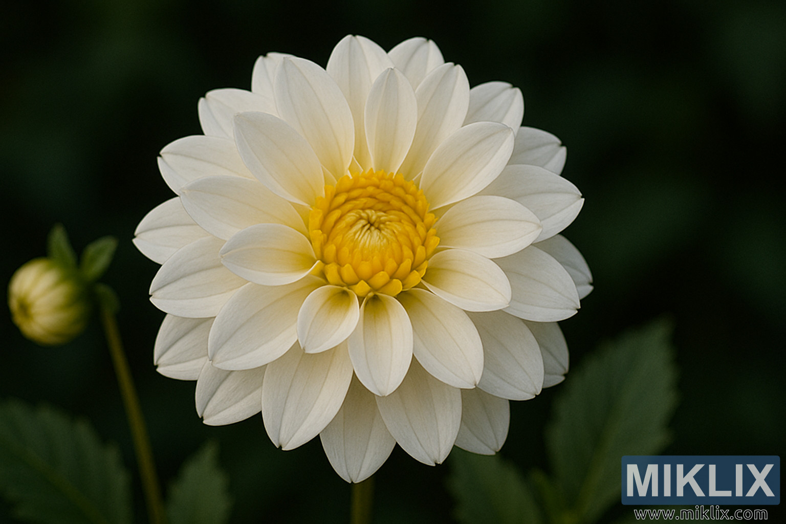 Dahlia Platinum Blonde yang berkilau dengan bagian tengah berwarna kuning keemasan yang cemerlang dan kelopak berwarna putih lembut, ditangkap dalam detail dan simetri yang elegan.
