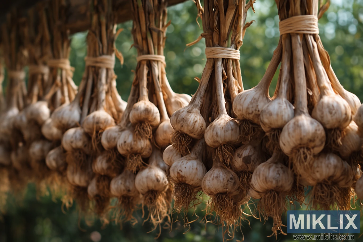 Foto beresolusi tinggi dari umbi bawang putih yang diikat dalam bundel dan digantung untuk dikeringkan di tempat terbuka yang berventilasi baik, menampilkan tekstur alami dan warna tanah yang hangat.