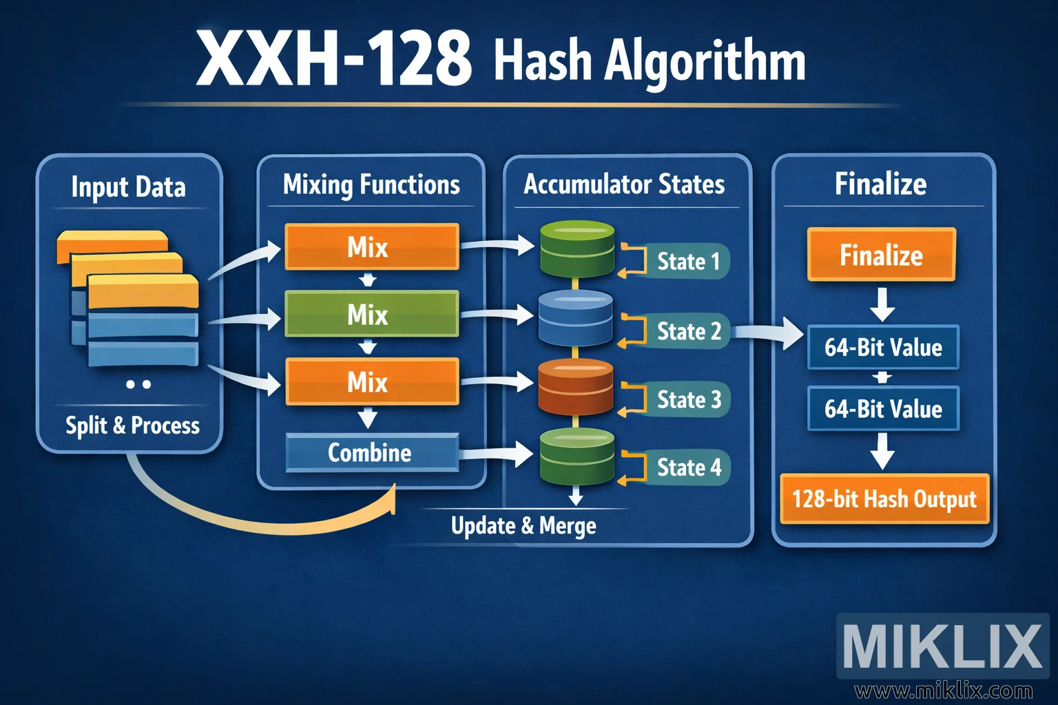 Secara keseluruhan, palet warna biru, oranye, dan hijau, dikombinasikan dengan bentuk bulat dan panah yang halus, menciptakan visualisasi tingkat tinggi yang mudah dipahami. Diagram ini menghindari detail teknis tingkat rendah dan lebih fokus pada alur konseptual dari data masukan, melalui pencampuran dan akumulasi, hingga nilai hash 128-bit akhir.