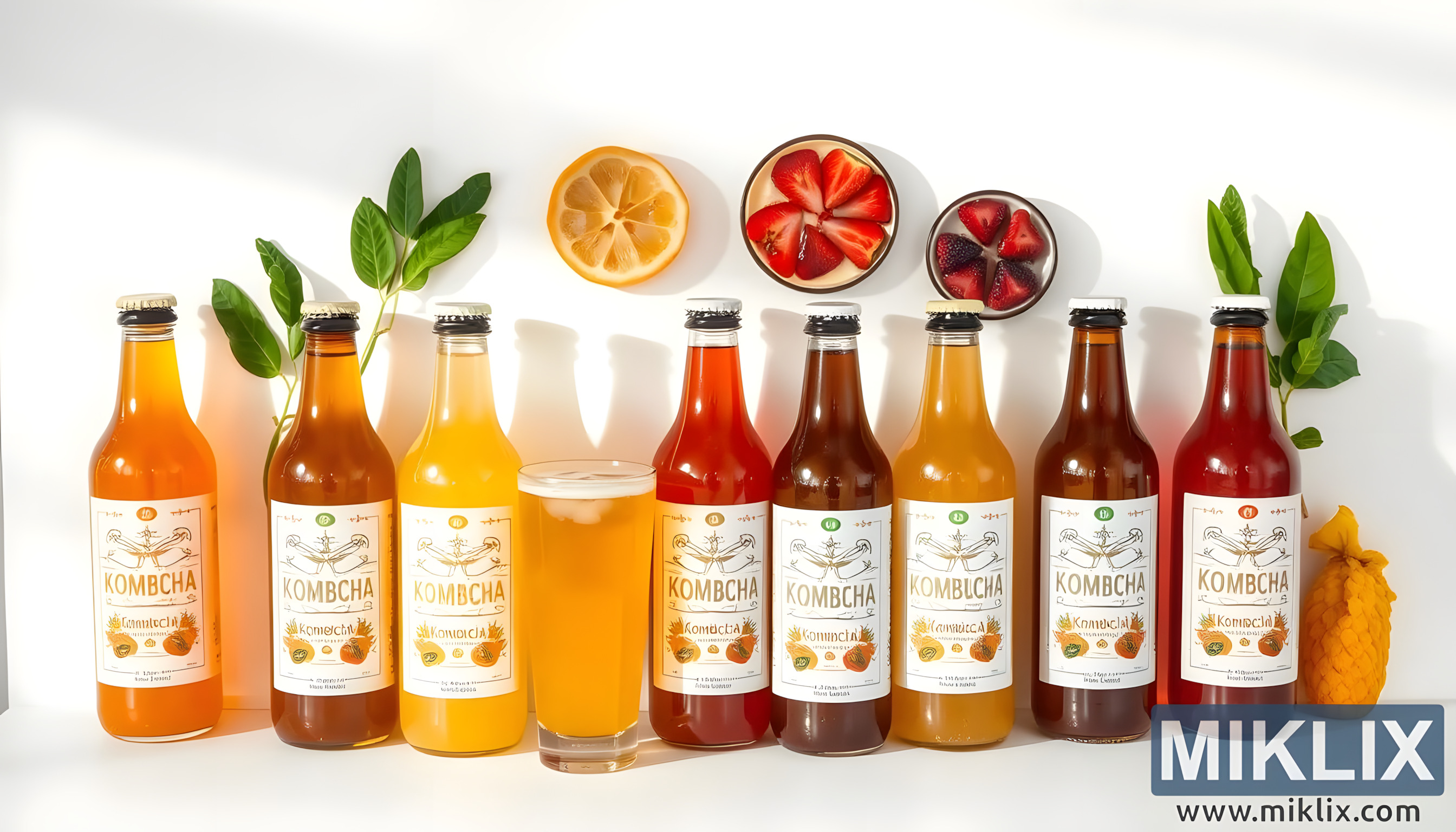 Secara keseluruhan, gambar ini merupakan perayaan kombucha yang dirancang dengan cermat, memadukan seni dengan fungsionalitas. Gambar ini menyoroti beragam rasa yang tersedia, asal-usul alami produk, dan nilai-nilai kesehatan yang terkandung dalam kombucha. Dengan palet warna yang cerah, minimalis yang elegan, dan sentuhan halus pada budaya kesehatan, rangkaian ini berhasil mengangkat kombucha menjadi sebuah pengalaman yang tidak hanya menyehatkan tubuh, tetapi juga memanjakan indra. Gambar ini menangkap esensi minuman yang telah lama dihargai karena kualitas probiotiknya, sekaligus menyajikannya dalam konteks modern dan penuh gaya yang menarik bagi para penggemar setia maupun pendatang baru yang penasaran dengan manfaatnya.