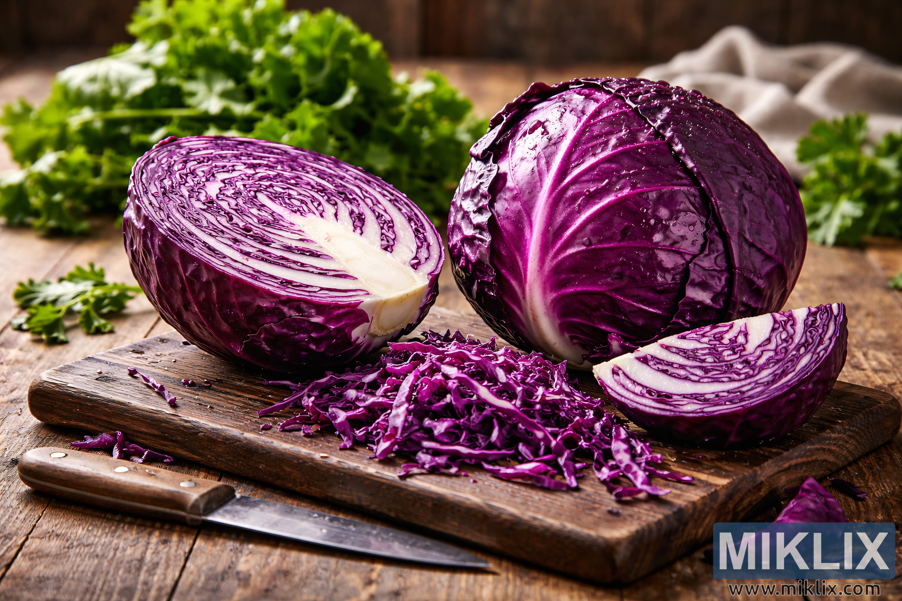 Foto beresolusi tinggi kol merah segar di atas meja kayu pedesaan, menampilkan kol utuh, bagian yang dibelah dua, dan daun yang diiris tipis di atas talenan.