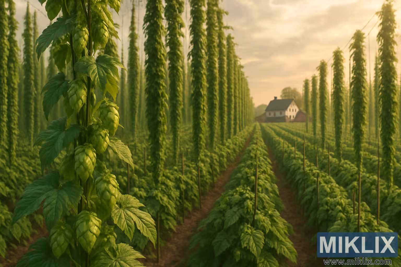 Pemandangan pedesaan berupa ladang hop pada saat jam emas, menampilkan hop yang tumbuh subur, bunga-bunga yang dipenuhi embun, dan rumah pertanian yang dibingkai oleh sinar matahari yang hangat.
