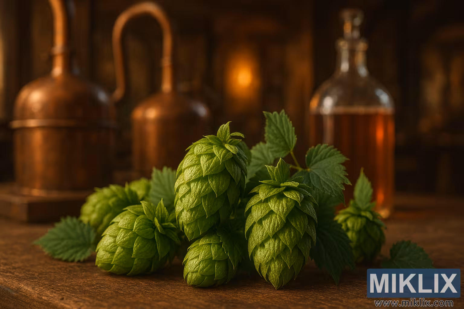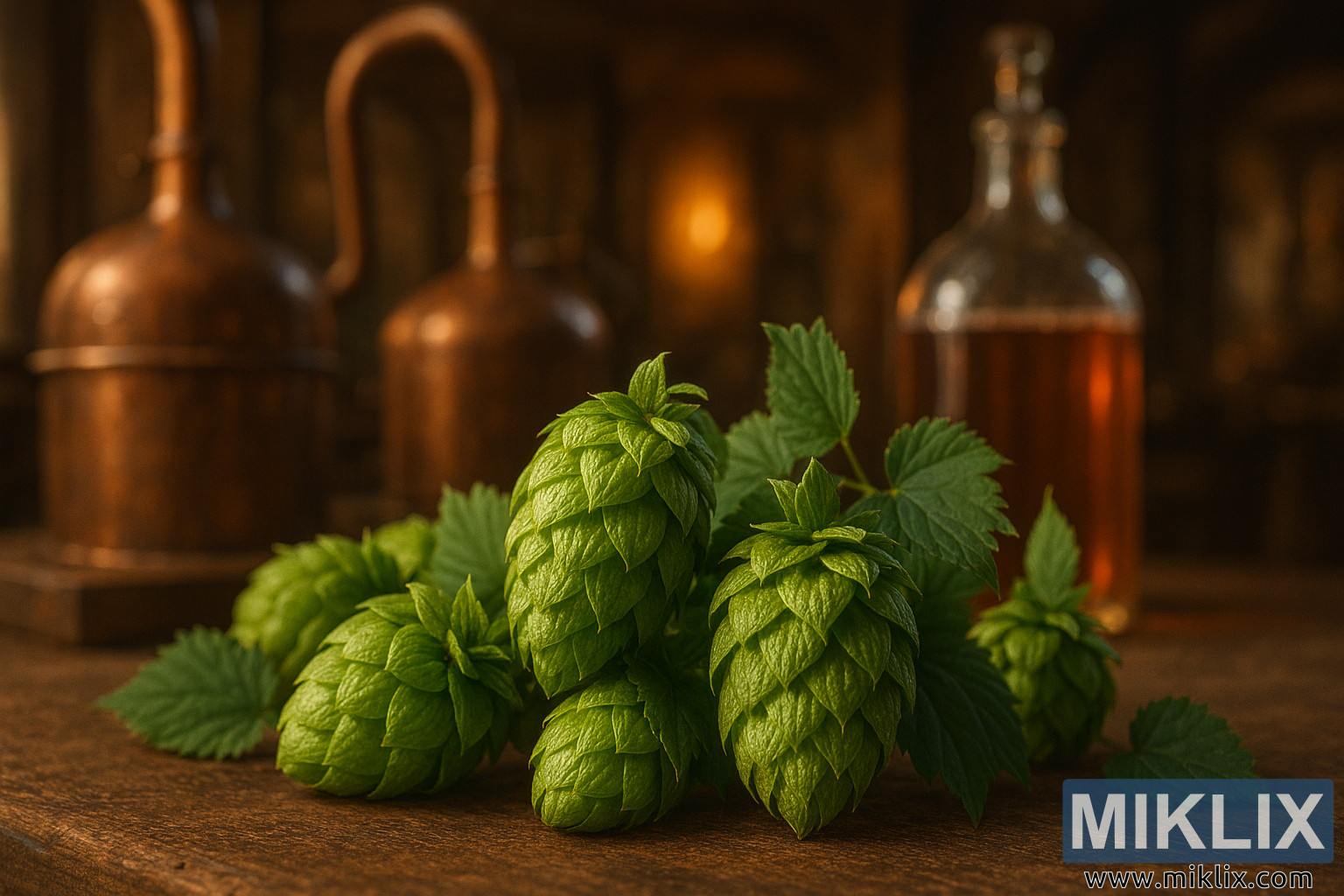 Pemandangan detail bunga hop hijau segar di atas kayu dengan alat penyuling tembaga dan botol amber di latar belakang, yang menangkap esensi artisanal dari produksi bir.