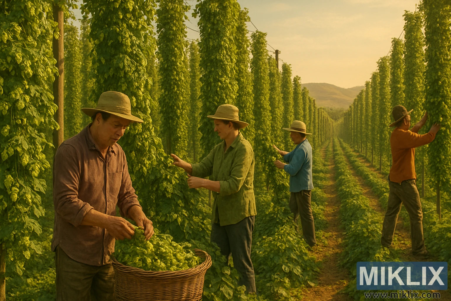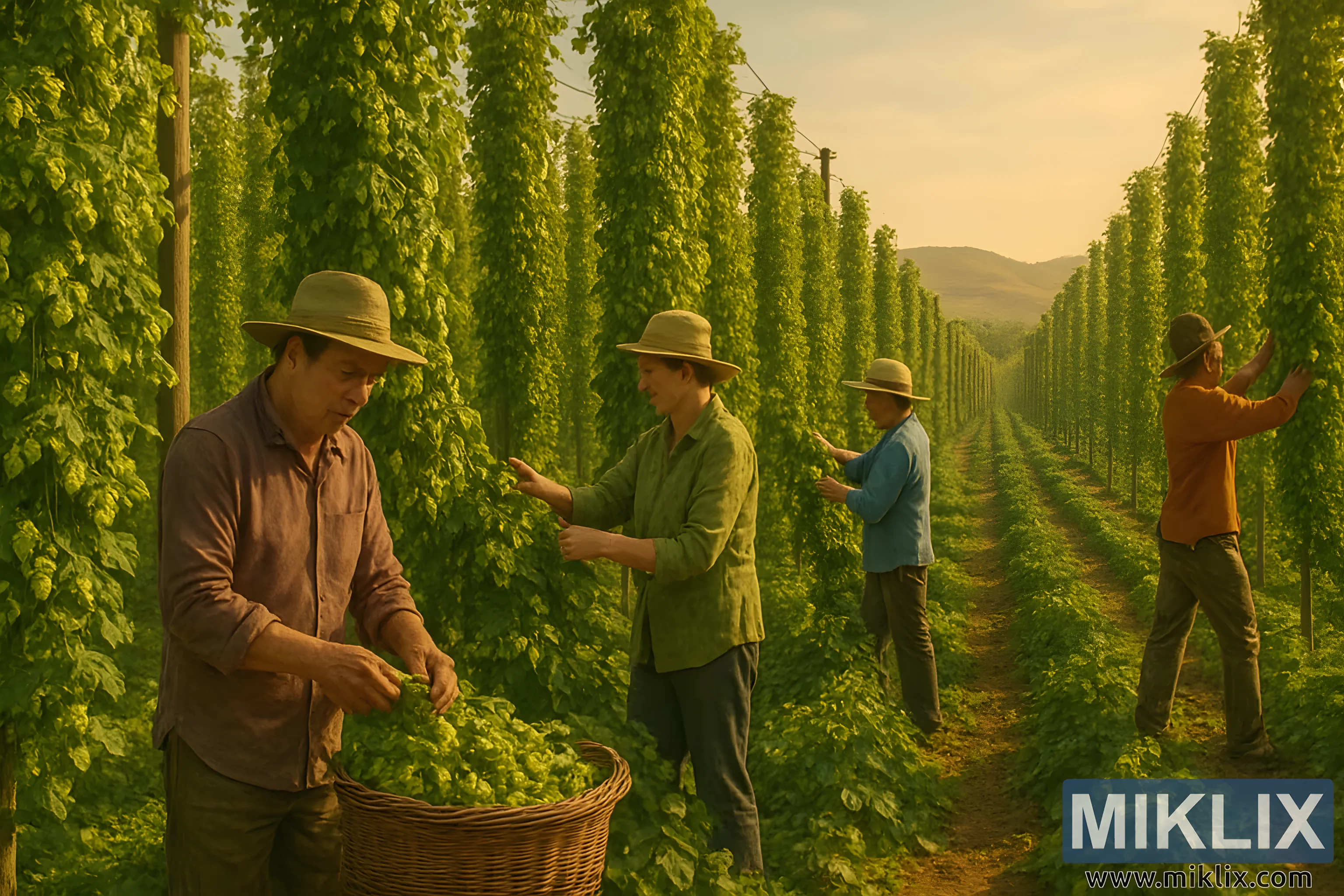 Di bawah cahaya musim gugur yang keemasan, para pekerja memanen hop Serebrianka dari pohon-pohon tinggi di ladang hop yang rimbun, dengan teralis dan perbukitan di latar belakang.
