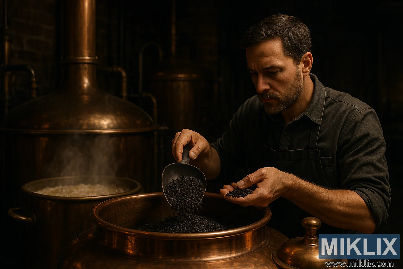 Gambar ini lebih dari sekadar potret proses pembuatan bir—ini adalah potret dedikasi dan seni. Gambar ini menangkap esensi sebuah kerajinan yang menghargai kesabaran, presisi, dan gairah. Malt gandum tengah malam, dengan rasa dan warnanya yang khas, bukan sekadar bahan, melainkan sebuah pernyataan, sebuah pilihan yang membentuk identitas bir. Fokus sang pembuat bir, kilauan tembaga, uap yang mengepul—semuanya berkontribusi pada suasana yang membumi sekaligus puitis. Ini adalah momen yang terhenti dalam waktu, di mana masa lalu membentuk masa kini, dan masa depan diseduh satu sendok demi satu sendok.