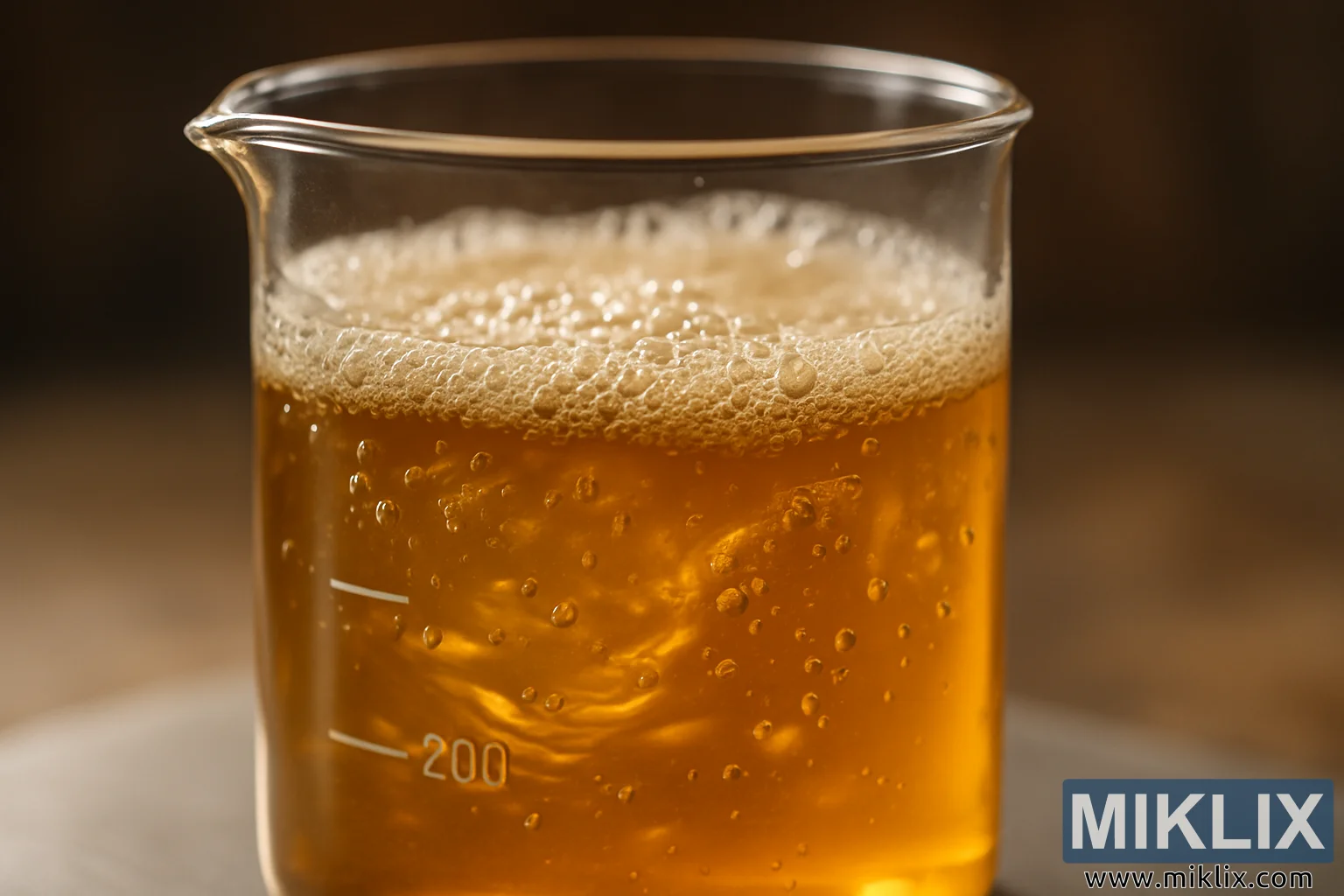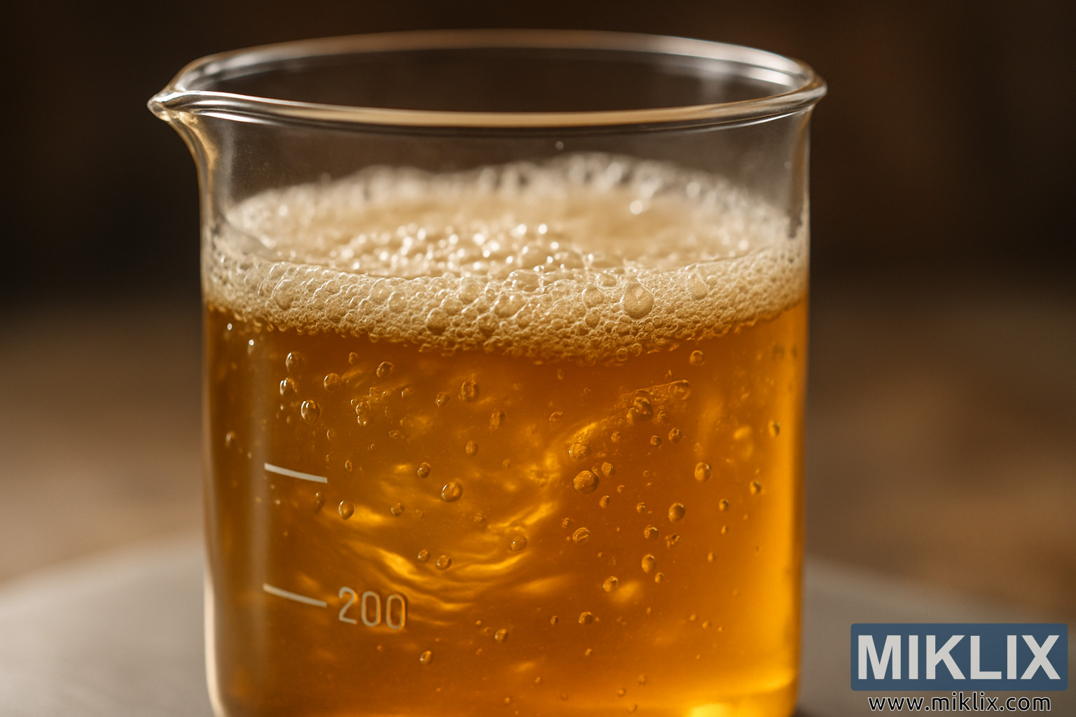 Dalam close-up yang menawan ini, penonton tertarik ke jantung eksperimen pembuatan bir di mana sains dan kerajinan bertemu dalam satu wadah. Gelas laboratorium transparan, ditandai dengan garis kalibrasi putih yang tepat, berdiri sebagai pusat komposisi. Tanda 200 mililiter ditampilkan dengan jelas, menambatkan pemandangan dalam konteks akurasi yang terukur dan transformasi yang terkendali. Di dalam gelas, cairan cokelat keemasan berputar dengan kehidupan, kejernihan dan ronanya mengingatkan pada kuning keemasan yang disinari matahari atau tuangan pertama bir yang baru diseduh. Cairan itu tidak statis—ia berdenyut dengan gerakan, dianimasikan oleh kekuatan fermentasi yang tak terlihat. Arus yang berputar-putar memutar dan melipat dalam cairan, menciptakan pola-pola memukau yang menunjukkan kekacauan dan keteraturan, metafora visual untuk tarian biokimia yang terjadi di bawah permukaan.