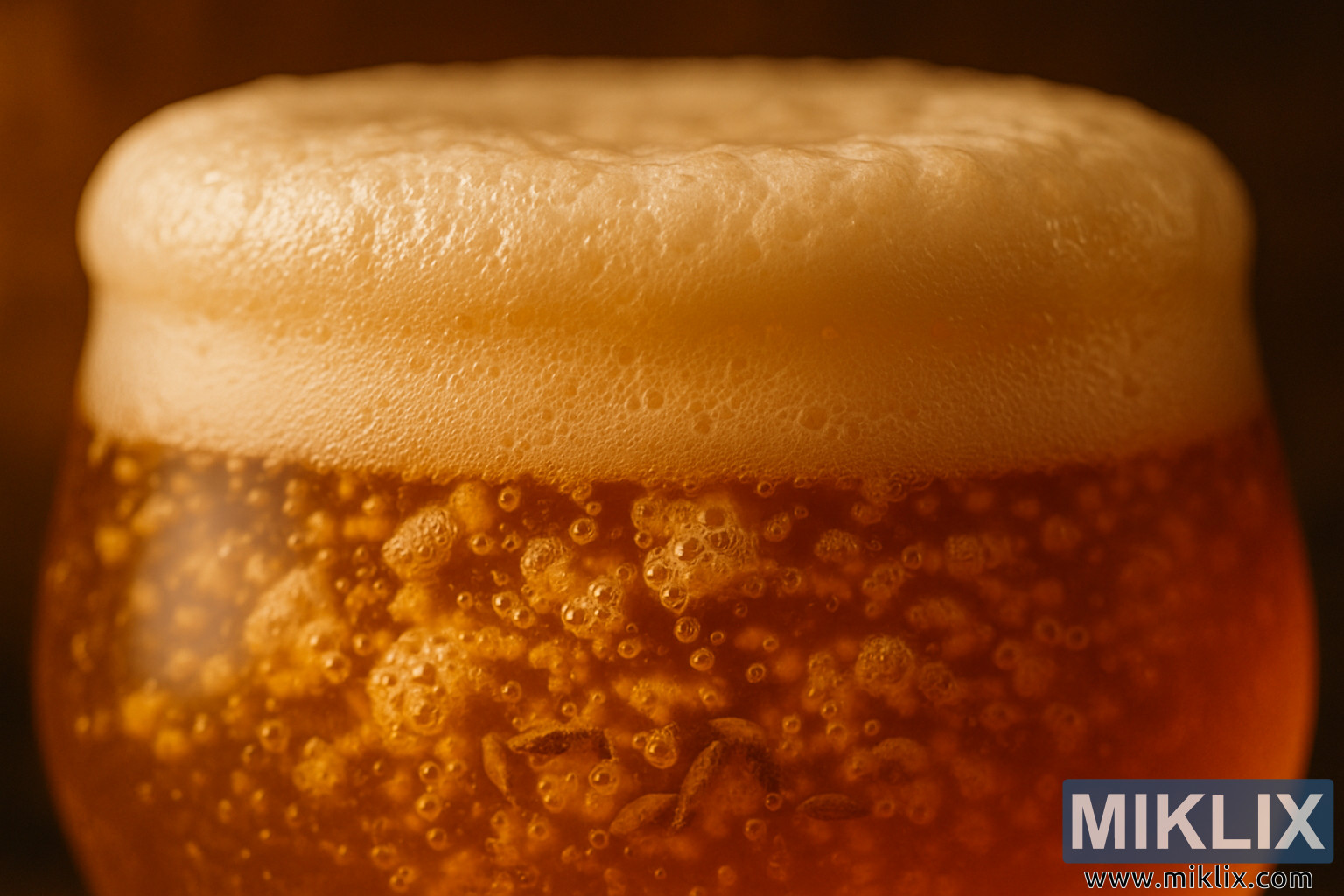 Kedalaman bidang pandang yang dangkal mempertajam fokus pemirsa pada bir itu sendiri. Latar belakang dikaburkan menjadi kabut lembut berwarna cokelat hangat dan keemasan, memastikan tidak ada gangguan yang mengurangi detail rumit dari cairan dan busa. Pilihan komposisi ini tidak hanya mengisolasi subjek tetapi juga memperkuat seni proses fermentasi, mengangkatnya dari sekadar transformasi teknis menjadi objek keindahan estetis.
