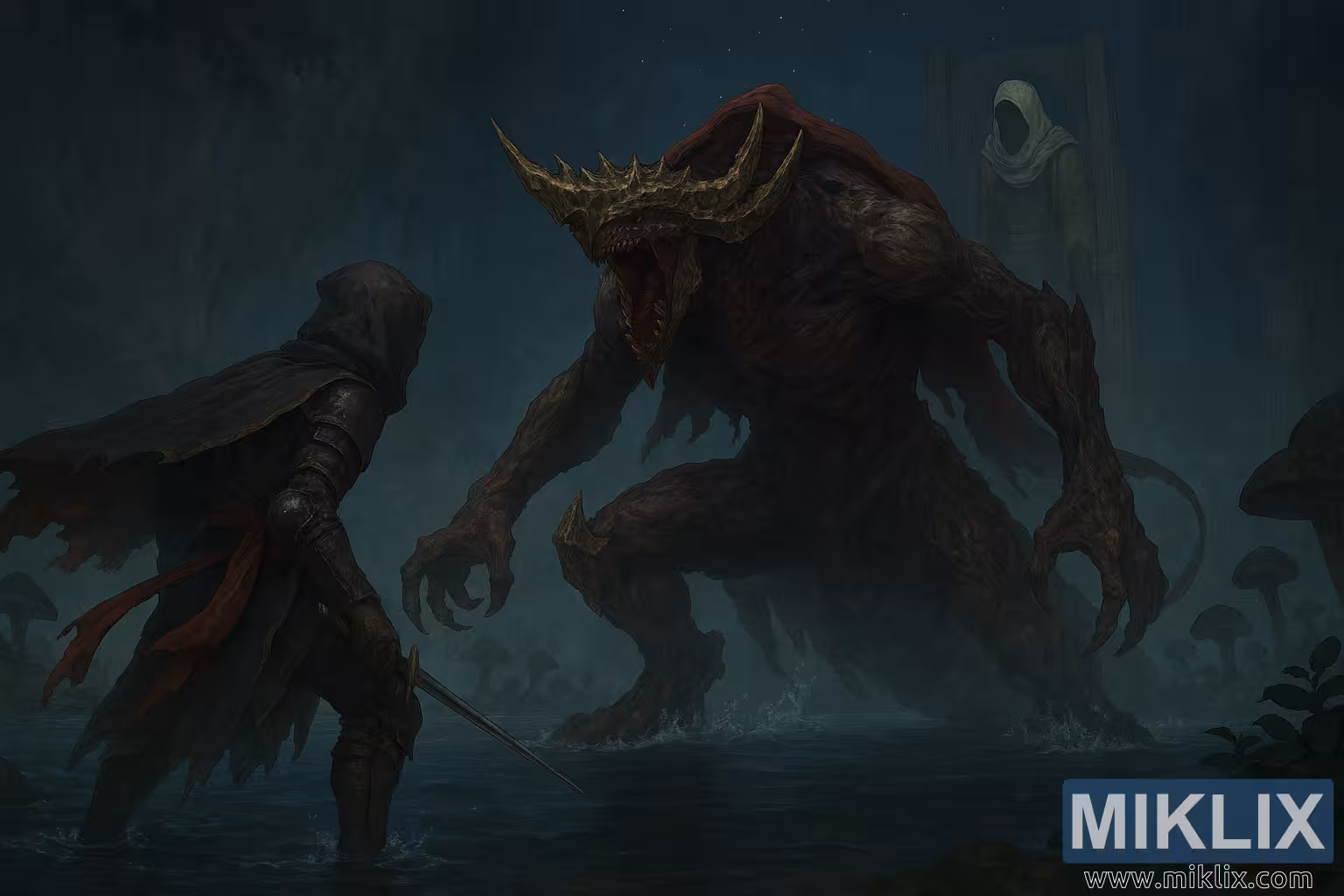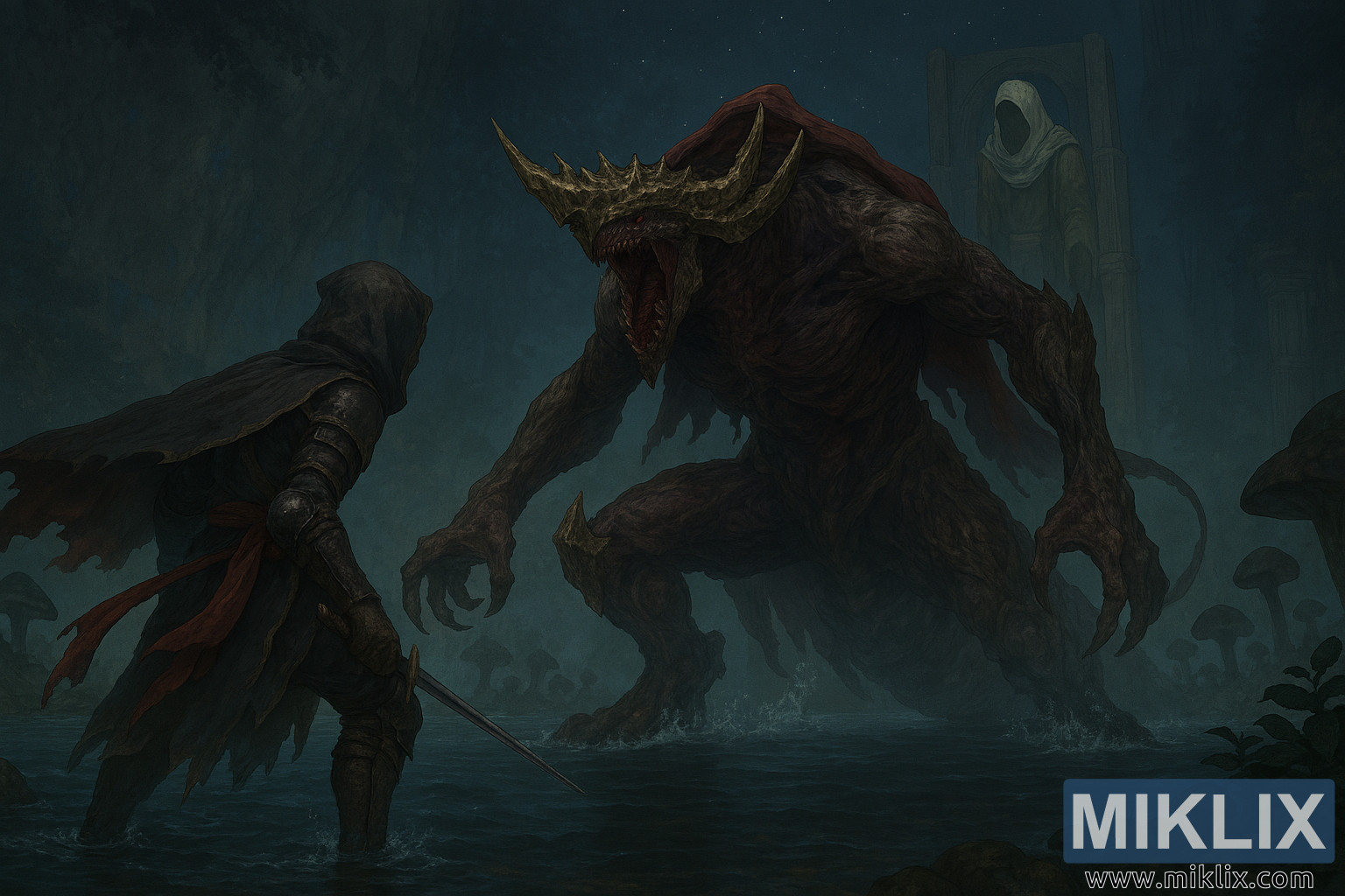 Karya seni fantasi atmosferik yang menggambarkan kaum Ternoda berhadapan dengan Prajurit Naga di Sungai Siofra, menangkap momen tegang sebelum pertempuran di Elden Ring.