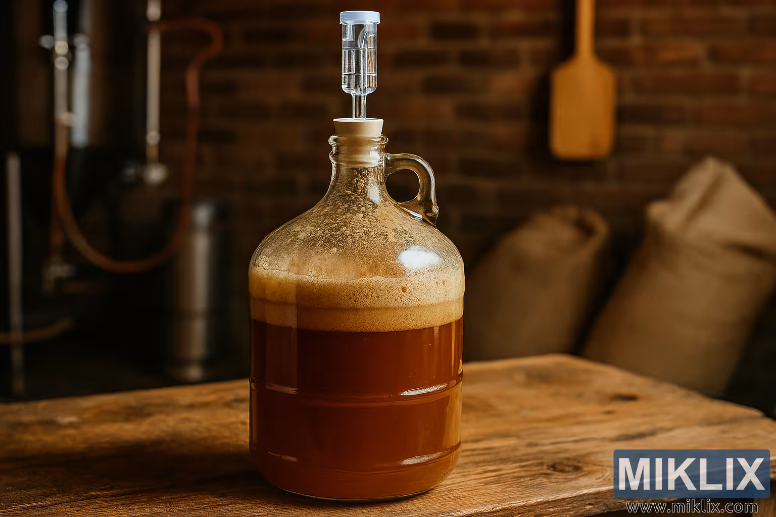 Í hvíta gúmmítappa flöskunnar er gegnsær plastlás, að hluta til fylltur með vatni. Loftlásinn samanstendur af lóðréttu röri sem liggur inn í U-laga hólf og litlu sívalningslaga toppi, sem er hannað til að losa gerjunarlofttegundir og koma í veg fyrir mengun. Lýsingin er hlý og náttúruleg, varpar mjúkum birtum á glerið og fíngerðum skuggum yfir borðið, sem undirstrikar áferð og dýpt atriðisins.