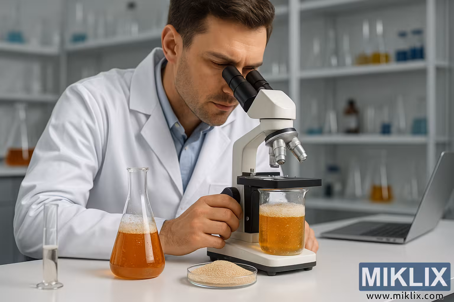 Rannsóknarstofumynd af brugghúsi þar sem tæknimaður í hvítum slopp notar smásjá til að greina gersýni, umkringdur flöskum, sívalningum og rannsóknarstofuverkfærum.