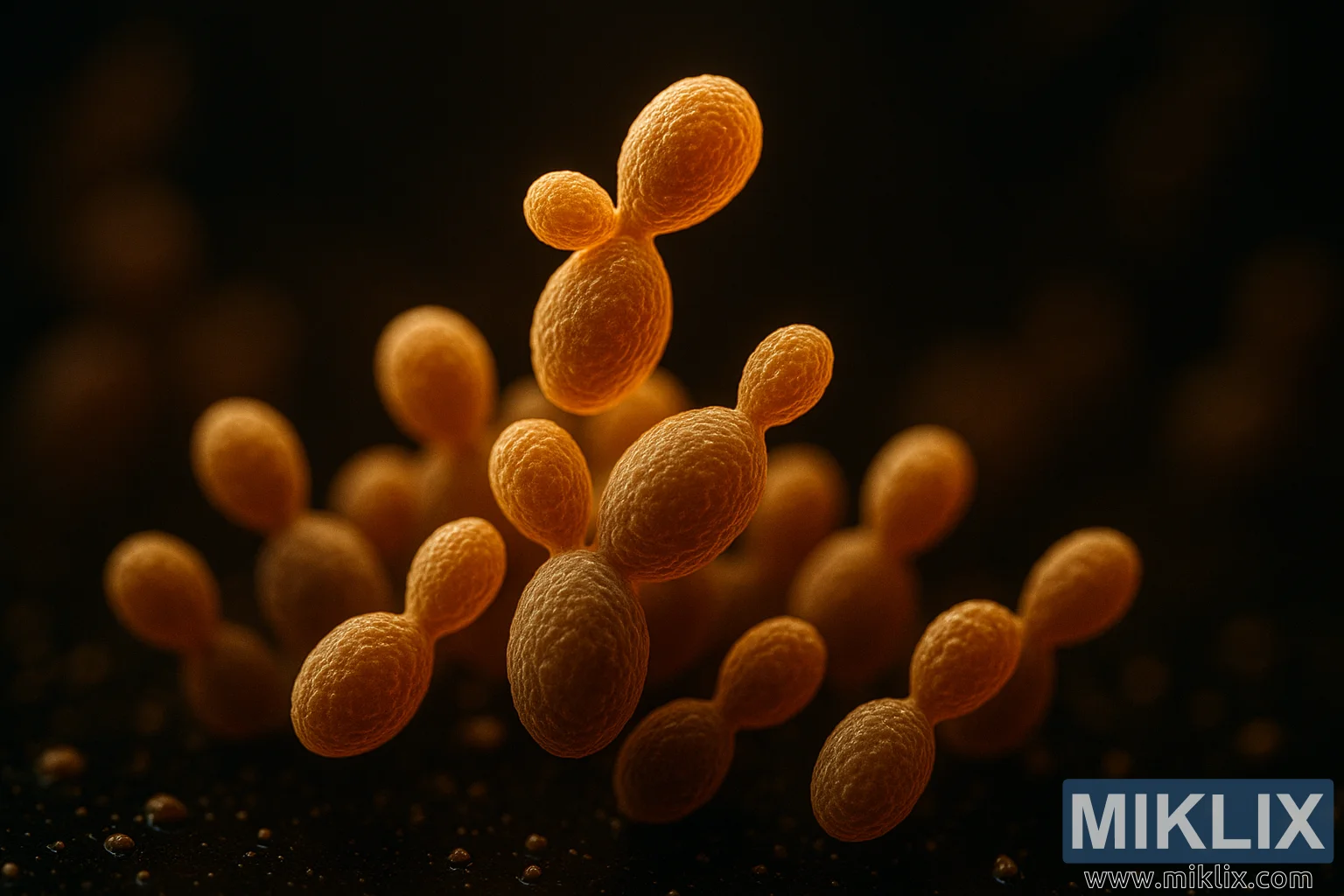 Þessi mynd býður upp á ótrúlega nána innsýn í smásæjan heim gerjunarinnar, þar sem ósýnilegt gersneiðarverk verður að lifandi sjónarspili líffræðilegrar danshöfundar. Í miðju verksins er þéttur hópur af Saccharomyces cerevisiae — sporöskjulaga, gulbrúnum frumum sem gerðar eru í einstaklega smáatriðum. Áferðarflötur þeirra glitrar undir hlýju, stefnubundnu ljósi og afhjúpar fínar hryggir og útlínur sem skilgreina uppbyggingu þeirra. Lýsingin er ekki bara fagurfræðileg; hún þjónar til að dramatisera kraftmikla eðli senunnar, varpa djúpum skuggum og geislandi birtum sem undirstrika þrívídd hverrar frumu. Þetta samspil ljóss og forms umbreytir gerinu úr einföldum örverum í aðalpersónur flókinnar, áframhaldandi umbreytingar.