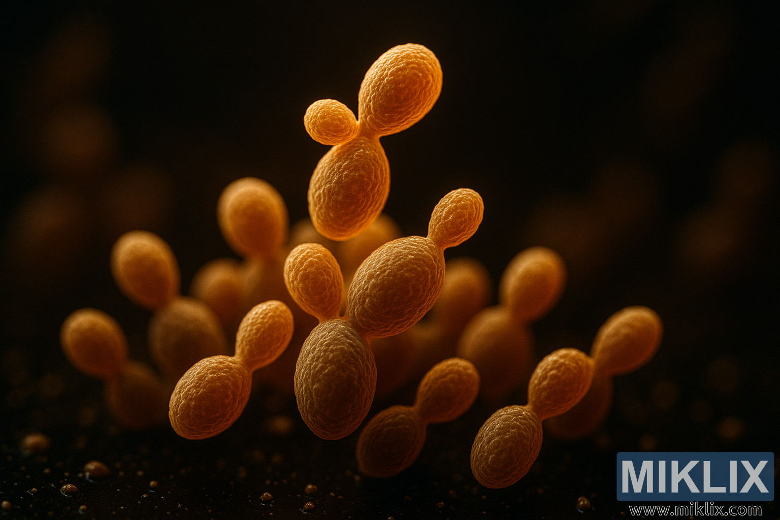 Bakgrunnurinn er gerður í djúpum, daufum tónum, óskýrum að því marki að hann er abstrakt. Þessi mjúka fókus einangrar gerklasann og gerir áhorfandanum kleift að einbeita sér að fullu að flóknum smáatriðum frumanna sjálfra. Andstæðurnar milli dökka bakgrunnsins og bjarta forgrunnsins auka sjónræn áhrif og láta gerið virðast næstum því skúlptúrlegt. Þetta er meðvitað val á myndbyggingu sem undirstrikar vísindalega nákvæmni myndarinnar en vekur jafnframt undrun. Óskýra umhverfið gefur til kynna rannsóknarstofuumhverfi - kannski gerjunarklefa eða smásjárpall - þar sem umhverfið er stjórnað en líffræðilegu ferlin eru enn kraftmikil og ófyrirsjáanleg.