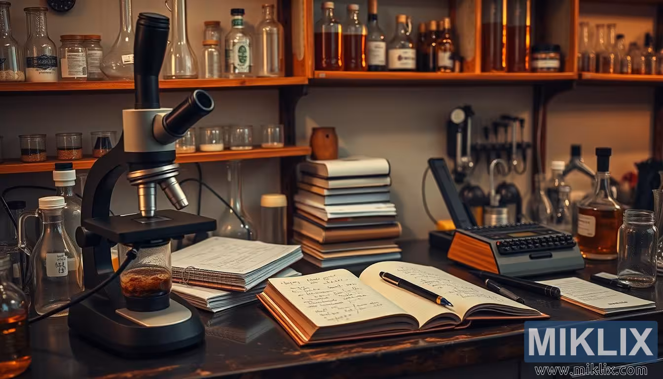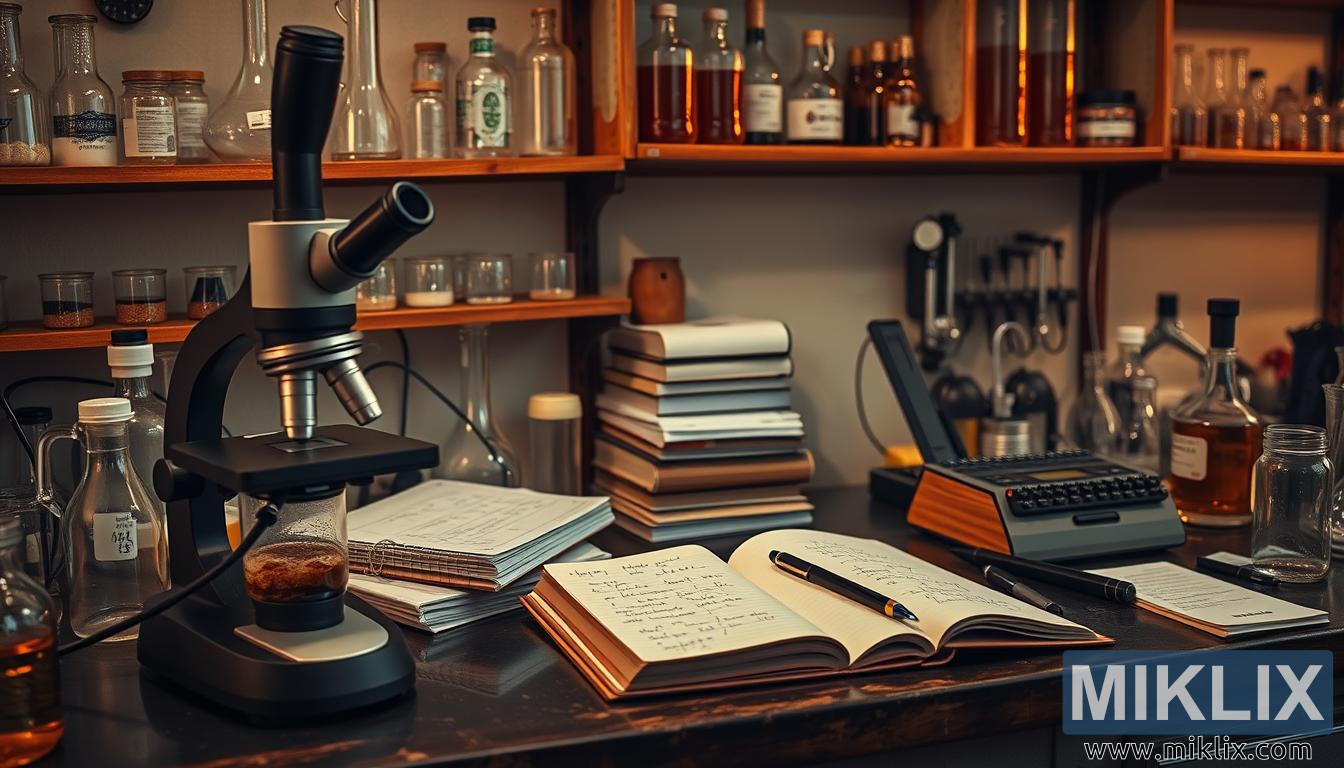 Hægra megin við smásjána liggur opin minnisbók, blaðsíður hennar fullar af handskrifuðum glósum sem teygja sig yfir línurnar í hraðskreiðum, lykkjum. Penni liggur á ská yfir blaðið, eins og vísindamaðurinn hafi rétt stigið frá í miðri hugsun. Glósurnar eru þéttar, merktar með örvum og undirstrikunum, sem bendir til þess að hugur vinni í gegnum tilgátur, skrái athuganir og fínstilli tilraunabreytur. Nálægt er stafli af lokuðum minnisbókum – sumar slitnar á brúnunum – sem talar til sögu rannsókna, samfellu í vinnu sem nær lengra en núverandi tilraun. Þessar bækur eru geymsla tilrauna og mistaka, innsýna sem hafa fengist og þrauta sem enn eru óleystar.