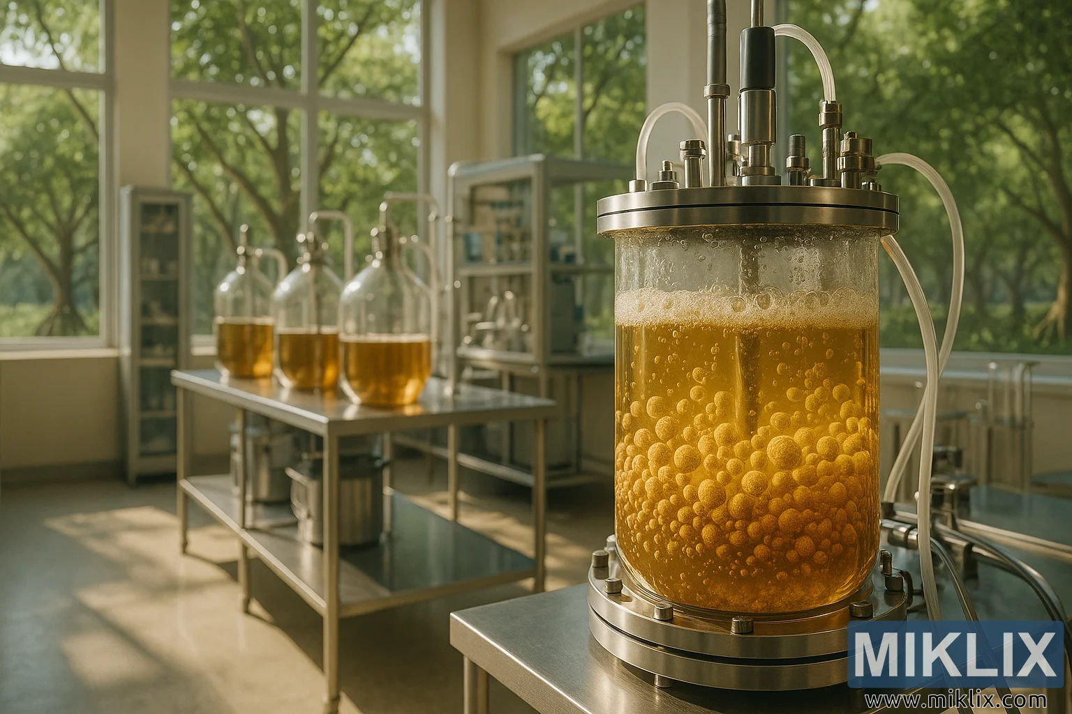 Í kringum lífræna hvarfefnið er net röra, loka og skynjara – hvert og eitt þeirra ber vitni um skuldbindingu rannsóknarstofunnar við stjórnun og nákvæmni. Þessir búnaður gerir kleift að stilla hitastig, sýrustig, súrefnismagn og næringarefnaflæði í rauntíma, sem tryggir að gerræktanir haldist heilbrigðar og afkastamiklar. Búnaðurinn er glæsilegur og nútímalegur, en samþætting hans í rýmið líður náttúrulega, eins og tæknin hafi ekki bara verið hönnuð til virkni heldur til sambúðar við náttúruna. Þetta þema heldur áfram inn í miðjuna, þar sem nokkur gerjunarílát úr gleri standa ofan á borðum úr ryðfríu stáli, innihald þeirra hvirflast mjúklega þegar örverulíf breytir hráu undirlagi í verðmætar lífefnafræðilegar vörur. Tærleiki glersins og einsleitni vökvans inni í því bendir til mikillar samræmis, sem er afleiðing nákvæmrar kvörðunar og faglegrar meðhöndlunar.