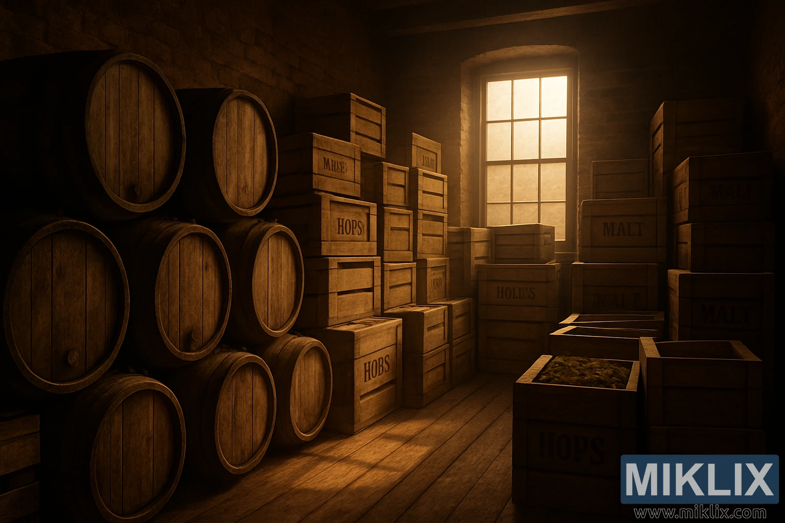 Geymsla í brugghúsi með staflaðum viðarkössum, eikartunnum og hlýju sólarljósi sem síast inn um einn glugga, sem minnir á hefð og handverk.