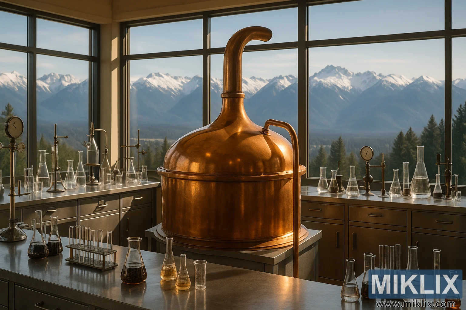 Róleg bruggunarstofa með glóandi koparketil, nákvæmum tækjum og víðáttumiklu útsýni yfir snæviþöktu Ólympíufjöllin.