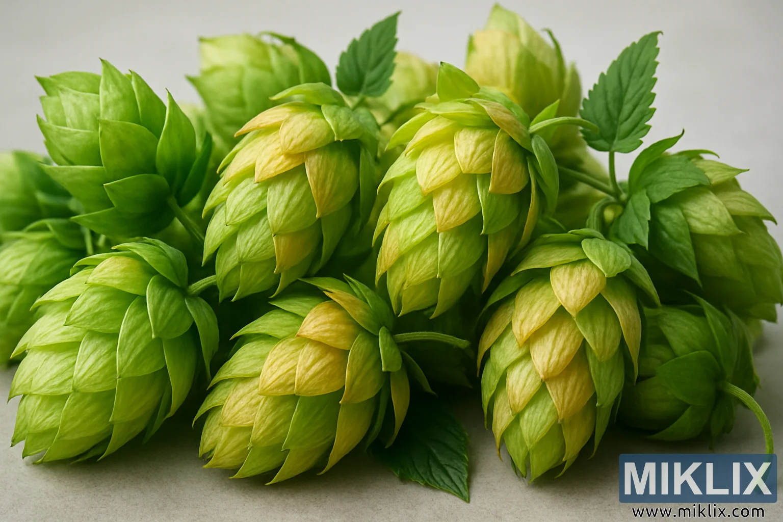 Könglarnir sjálfir virðast þéttir og heilbrigðir, hver og einn þéttpakkaður, yfirborð þeirra merkt með lúmskum breytingum á litbrigðum og lögun. Laufáferð þeirra dregur augað inn á við, býður upp á nánari skoðun, næstum freistandi áhorfandans til að ímynda sér að velta einum varlega á milli fingranna og losa sprengingu af kvoðukenndum olíum innan frá. Þessir kirtlar, sem eru ósýnilegir hér en djúpt til staðar í uppbyggingu könglanna, geyma kjarna beiskju, ilms og bragðs sem einkennir handverk bruggarans. Fáein græn lauf og stilkar meðal könglanna festa myndina í sessi og minna okkur á uppruna þeirra í landbúnaði, á akra fóðraðir háum humalstönglum sem klifra upp til himins í vandlegum röðum, nærðir af jarðvegi, sól og þolinmóðum höndum. Jafnvel á móti hreinum, daufum bakgrunni viðhalda humlarnir lífsþrótti og tengslum við náttúruna, litir þeirra og form staðfesta bæði fegurð þeirra og virkni.