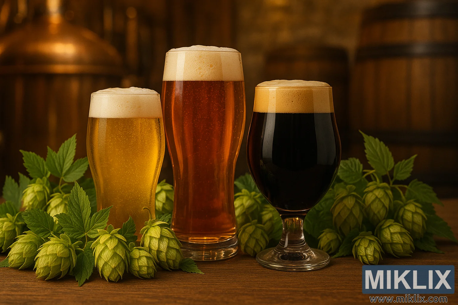 Lager, öl og stout bjór ásamt humlum frá Petham Golding, við hliðina á hlýlegu, upplýstu brugghúsi með koparkatlum og tunnum, sem undirstrikar brugghefðina.