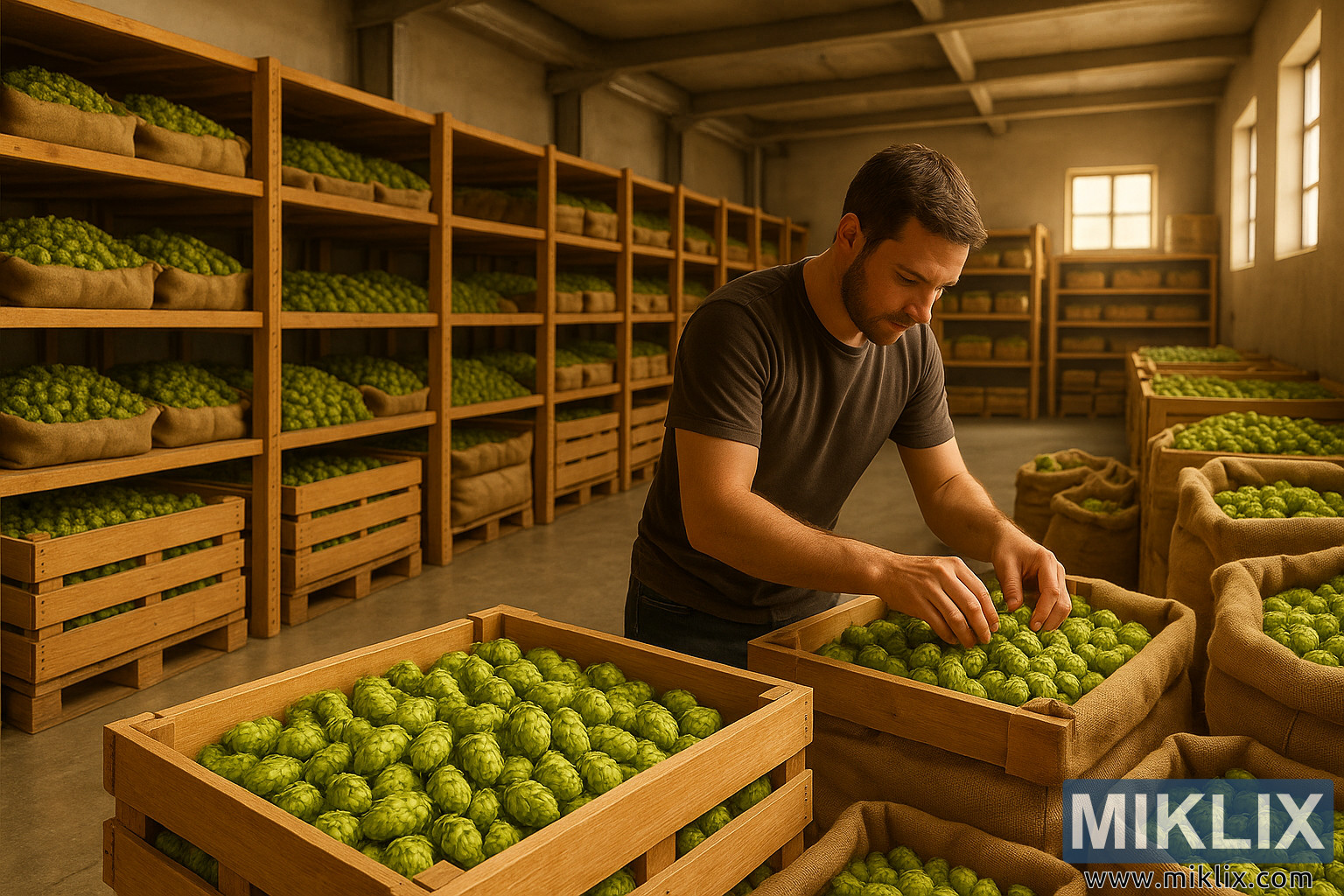 Rúmgóð humalgeymsla með kössum og sekkjum af Tettnanger-humli, hlýju náttúrulegu ljósi og starfsmanni sem kannar gæði og leggur áherslu á vandvirkni í bruggunarhráefnum.