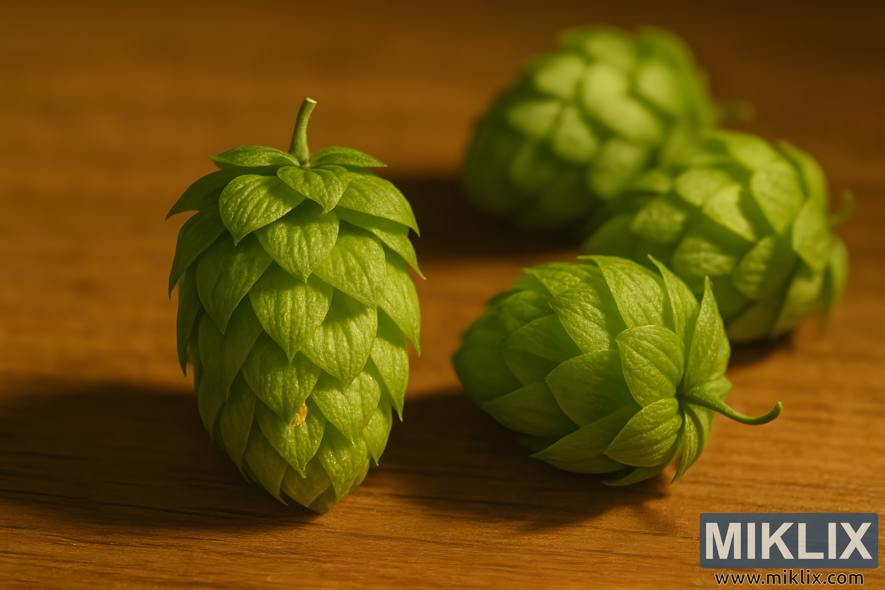 Bakgrunnurinn, sem er úr sléttu viðarfleti, glóir mjúklega undir sömu gullnu birtu. Hlýir tónar hans standa fallega í andstæðu við ferska græna litinn í humlum og skapa litasamræmi sem minnir á bæði sveitalega hefð og lífræna lífskraft. Viðaráferðin er sýnileg en látlaus og þjónar sem kyrrlátt svið sem styður við og lyftir upp náttúrulega lífleika humlanna án þess að trufla hann. Mjúkir skuggar sem könglarnir varpa auka tilfinninguna fyrir dýpt og áferð, jarðtengja vettvanginn og gera hann nánast óumdeilanlegan og raunverulegan.