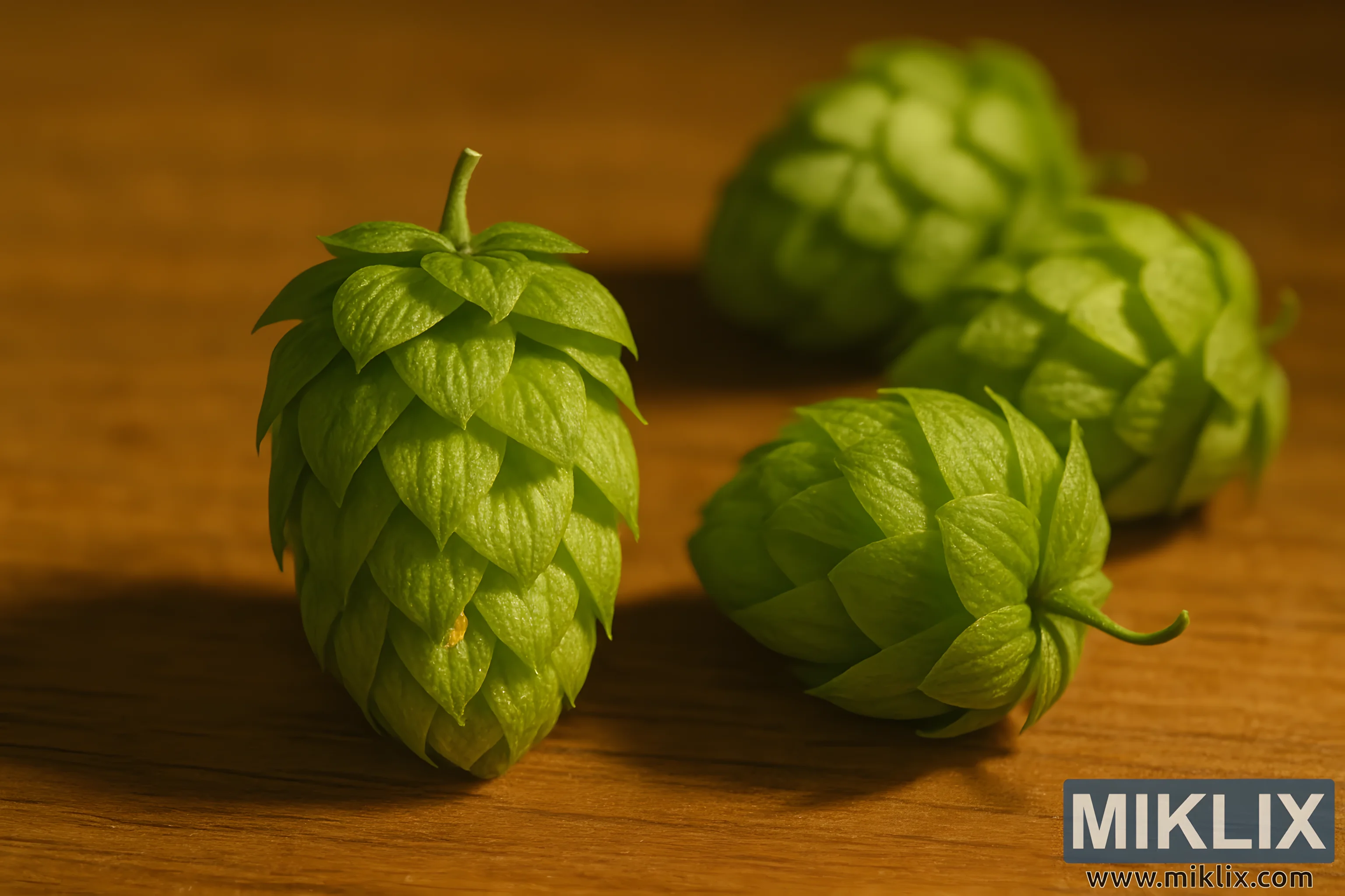 Til hliðar, örlítið óskýr vegna grunns dýptarskerpu, liggja þrír humalkeglar til viðbótar á viðarfletinum. Mýktar brúnir þeirra og dreifðari lýsing skapa dýptartilfinningu og beina augunum aftur að skarpt afmörkuðu viðfangsefni í forgrunni. Leikur skarps fókuss á móti vægri óskýrleika endurspeglar jafnvægi smáatriða og andrúmslofts og tryggir að athygli áhorfandans haldist föst á áferð og flækjum aðalkeglunnar en samt sem áður aðdáandi breiðari uppröðunarinnar. Stefna könglanna er örlítið breytileg - sumir liggja á hliðinni, aðrir í ská - sem bætir náttúrulegum takti við samsetninguna og forðast stífleika. Þessi lúmska breyting eykur tilfinninguna fyrir því að humalarnir hafi nýlega verið tíndir og settir niður af auðveldum hætti.