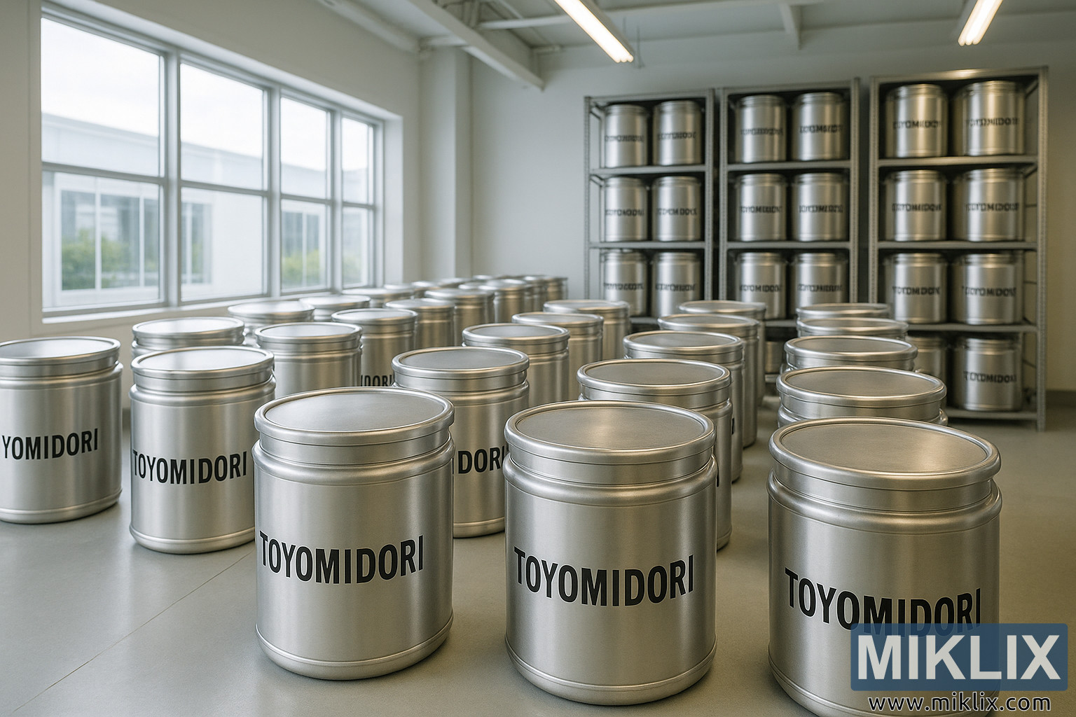 Í forgrunni, sem teygja sig inn í miðjuna, eru raðir af sívalningslaga ílátum úr ryðfríu stáli sem ráða ríkjum í rýminu. Hvert ílát er eins að lögun og frágangi, burstað málmfletir þeirra fanga mjúkar endurskin dagsbirtunnar sem streymir inn um stóru gluggana vinstra megin við rammann. Ílátin eru merkt „TOYOMIDORI“ með feitletraðri, svörtu, sans-serif letri, prentuð hreint og áberandi á bogadregnum hliðum þeirra. Samræmd leturgerð gefur blæ staðlaðrar og gæðaeftirlits, sem styrkir þá hugmynd að það sem þau innihalda sé verðmætt og vandlega meðhöndlað. Lokin þeirra eru þétt innsigluð, brúnirnar fullkomlega jafnaðar og þau sitja með rúmfræðilegri nákvæmni á sléttu, fægðu steingólfi. Fínlegir breytingar á ljósi á málmfletunum skapa dýpt og tilfinningu fyrir áþreifanlegri þyngd, á meðan mjúkir skuggar undir hverjum sívalningi festa þá sjónrænt við rýmið.
