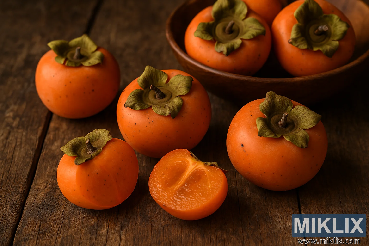 Þessi ljósmynd sýnir náið og ríkulega kyrralíf af þroskuðum amerískum persimmonum (Diospyros virginiana) raðað á gróft tréborð. Ávextirnir, kringlóttir og þéttir með djúpum appelsínugulum lit, geisla frá sér hlýju og ferskleika undir mjúku, náttúrulegu ljósi sem varlega dregur fram slétta, örlítið flekkótta hýðið. Hver persimmon er þakinn grænbrúnum bikar þar sem krullaðir bikarblöð bæta við jarðbundinni andstæðu bæði í lit og áferð. Myndbyggingin dregur augu áhorfandans yfir fjölbreytt sjónræn atriði: í forgrunni sýnir helmingaður persimmon glitrandi, gegnsætt appelsínugult kjöt, sem gefur til kynna þroska og sírópskennda sætleika sem virðist næstum áþreifanlega. Skurðflöturinn er rakur og bjartur, með fíngerðum endurspeglunum sem fanga umhverfisljósið í smáatriðum. Í kringum hann eru fimm heilir ávextir vandlega staðsettir, lögun þeirra og stefnur valdar til að leggja áherslu á náttúrulegan breytileika og ófullkomleika - örsmáar blettir, lúmskar marblettir og smávægilegar breytingar á áferð sem votta lífræna áreiðanleika þeirra.