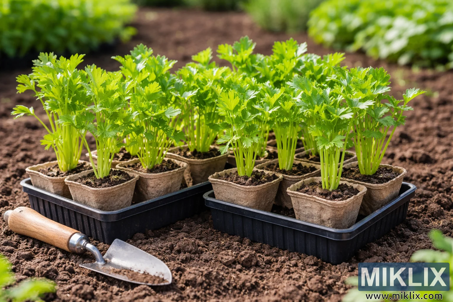 Myndin sýnir snyrtilega uppröðun ungra selleríplantna sem eru tilbúnir til gróðursetningar í garði, tekin í víðáttumikið, landslagsmiðað samsetningarferli. Spírurnar eru líflegar og heilbrigðar, með skærgræn laufblöð með fíngerðum, tenntum brúnum og mjóum, fölgrænum stilkum. Hver hópur spírna vex úr dökkri, rökri pottamold sem er geymd í litlum, niðurbrjótanlegum torfpottum. Þessir pottar eru settir í svarta plastbakka sem hvíla beint á frjósamri, nýplægðri garðmold. Jarðvegurinn í kringum bakkana virðist laus og molnandi, með jarðbrúnum lit sem stendur sterklega í andstæðu við skærgrænu laufblöðin.