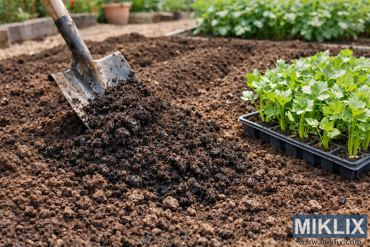 Myndin sýnir víðáttumikið landslagsútlit af beði sem verið er að undirbúa vandlega fyrir selleríplöntun. Áherslan er á ríka, dökkbrúna mold sem hefur verið losuð og snúið við, sem sýnir molna og vel loftræsta áferð sem bendir til heilbrigðrar uppbyggingar og góðrar frárennslis. Blandið saman við ljósari jarðveginn er rausnarlegt magn af mold, sýnilegt sem dekkra, lífrænt efni með fínum ögnum og litlum trefjabitum, sem bendir til niðurbrots plantna. Sterk málmspaðla með örlítið slitnu blaði og sléttu tréhandfangi er að hluta til grafin í moldinni nálægt forgrunni, á ská eins og hún hafi nýlega verið notuð til að brjóta moldina inn í beðið. Moldarklumpar hvíla á skóflublaðinu og leggja áherslu á virka ferlið við jarðvegsundirbúning frekar en fullunna mynd. Til hægri við spaðlann er svartur plastbakki með nokkrum ungum selleríplöntum. Spírurnar eru skærgrænar, með uppréttum, fíngerðum stilkum og tenntum laufum sem líta ferskar, heilbrigðar og tilbúnar til ígræðslu út. Björt litur þeirra stendur sterklega í andstæðu við dökka moldina, dregur að sér augað og gefur greinilega til kynna uppskeruna sem ætluð er fyrir þetta beð. Bakkinn stendur beint á jörðinni, sem gefur til kynna að gróðursetning hefjist strax eftir að jarðvegsframkvæmdum er lokið. Í miðjunni og í bakgrunni eru upphækkaðir beð og gróskumikil gróður mjúklega úr fókus, sem veitir samhengi án þess að trufla aðalatriðið. Nærliggjandi plöntur virðast vel hirtar, sem styrkir myndina af afkastamiklum og vandlega stjórnuðum garði. Náttúrulegt dagsbirta lýsir upp umhverfið jafnt, varpar mjúkum skuggum og dregur fram áferð jarðvegs, moldar, málms, viðar og laufblaða. Heildarstemningin er róleg, hagnýt og nærandi og fangar stund af handlegri garðyrkju sem leggur áherslu á sjálfbærni, undirbúning og athygli á heilbrigði jarðvegsins sem grunn að farsælum sellerívexti.