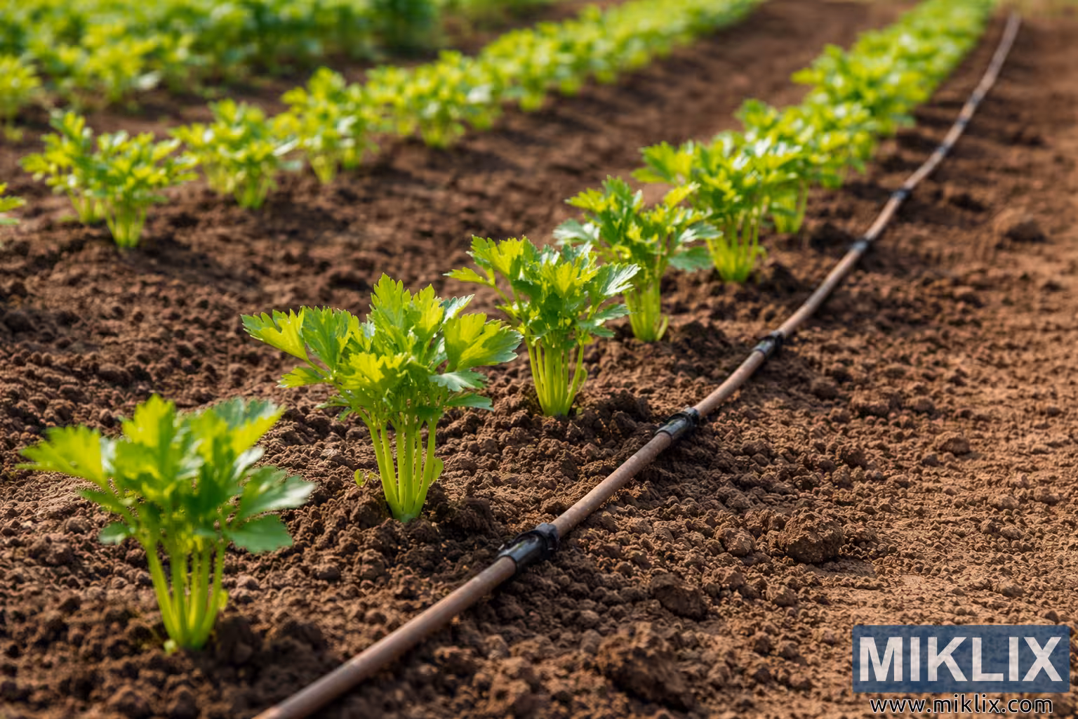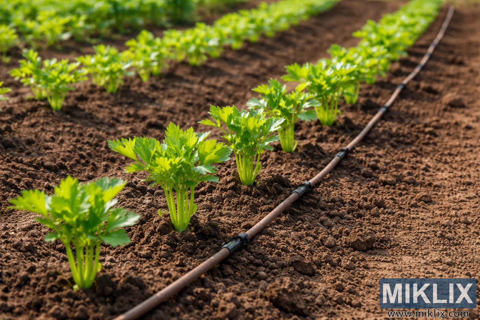 Jarðvegurinn í kringum plönturnar er dökkbrúnn og laus, með örlítið kornóttri áferð sem bendir til þess að hún hafi nýlega verið unnin og vökvuð. Lítil kekkir og fínar agnir eru sýnilegar, sem bendir til góðrar jarðvegsbyggingar fyrir rótarmyndun. Samhliða selleríröðinni liggur dropavökvunarlína, dökk á litinn og að hluta til soðin í jarðveginn. Vökvunarleiðslurnar styrkja myndina af skipulagðum og vel hirtum garði sem er hannaður fyrir skilvirka vatnsnotkun og samræmda umhirðu plantna.