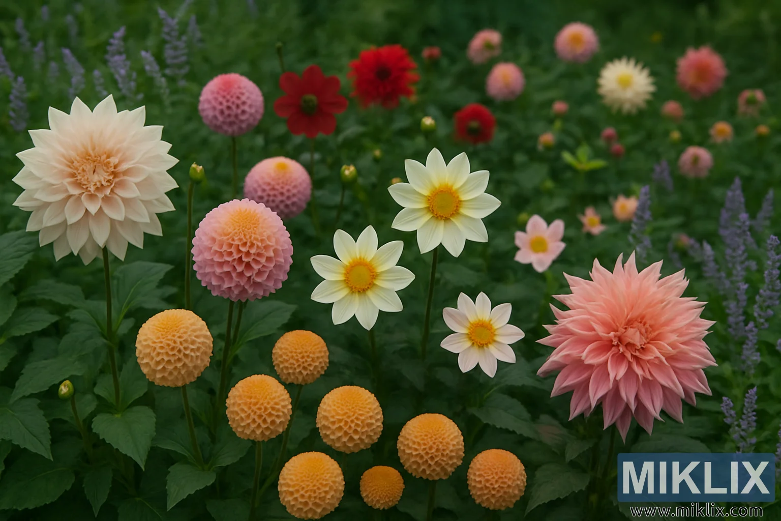 Dökkgrænt lauf, dreift um allt samsetninguna, myndar gróskumikið striga sem leyfir litum blómanna að geisla af skýrleika og styrk. Samhliða plöntur bæta við enn frekari dýpt og ríkidæmi: Tindar af fjólubláum blómum rísa á milli dalíanna og skapa lóðrétta áherslu sem vega upp á móti ávölum dalíuformum og kæla lúmskt litavalið. Í óskýrum bakgrunni teygir sig hafsjór af viðbótardalíum - mjúkbleikum, rjómalöguðum hvítum, gullnum gulum og skærum rauðum - út í fjarska og vekur upp tilfinningu fyrir garði sem er fullur af fjölbreytni og gnægð.