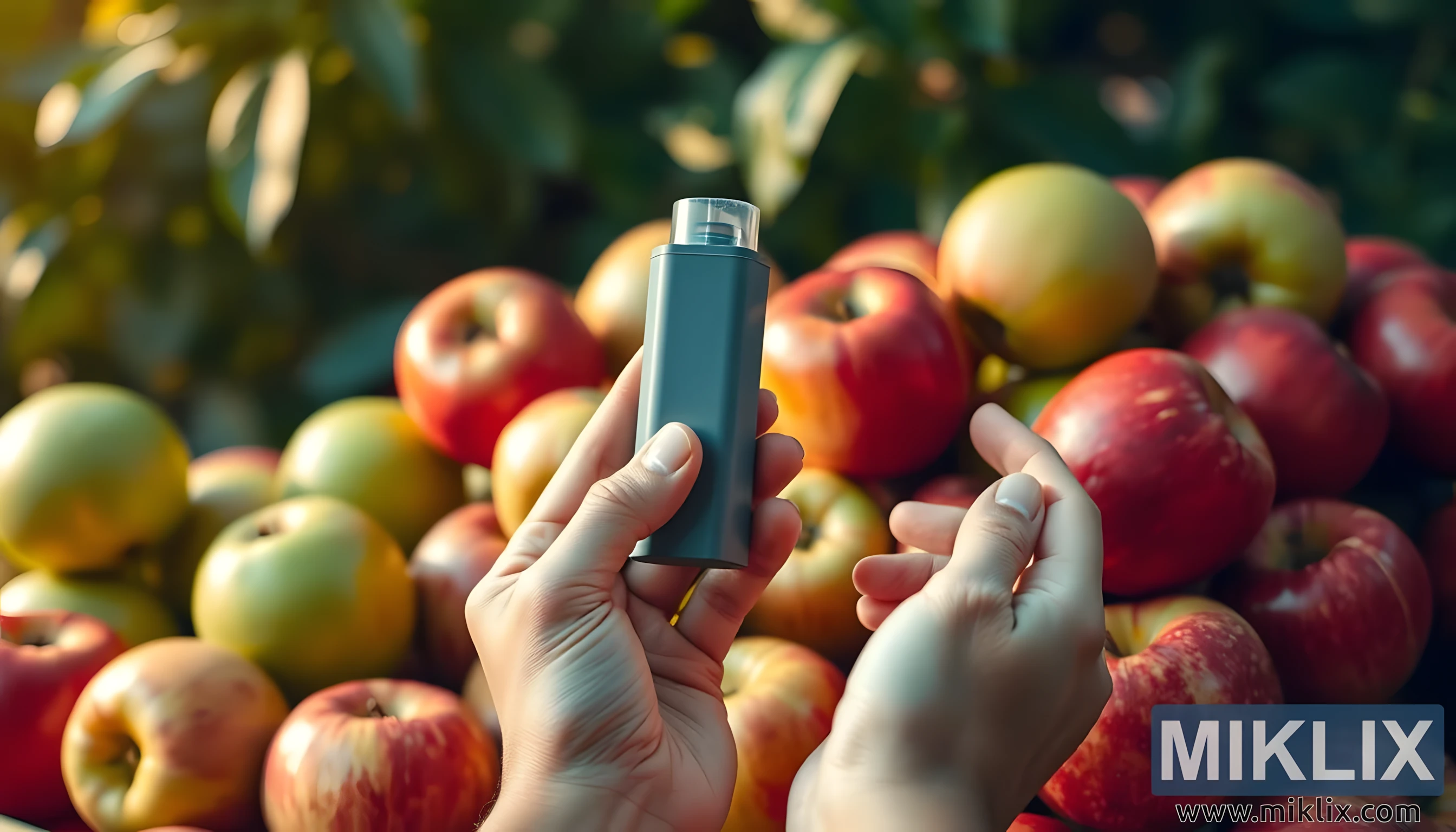 Kyrralífsmynd af rauðum og grænum eplum með höndum sem halda á innöndunartæki, sem táknar tengslin milli eplaneyslu, náttúrulegrar lífsþróttar og öndunarheilsu.