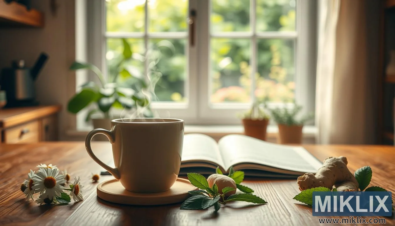 Notaleg eldhúsmynd með gufandi jurtatei, kamillu, myntu, engifer og opinni bók um meltingarheilbrigði, í gróskumiklum garði.