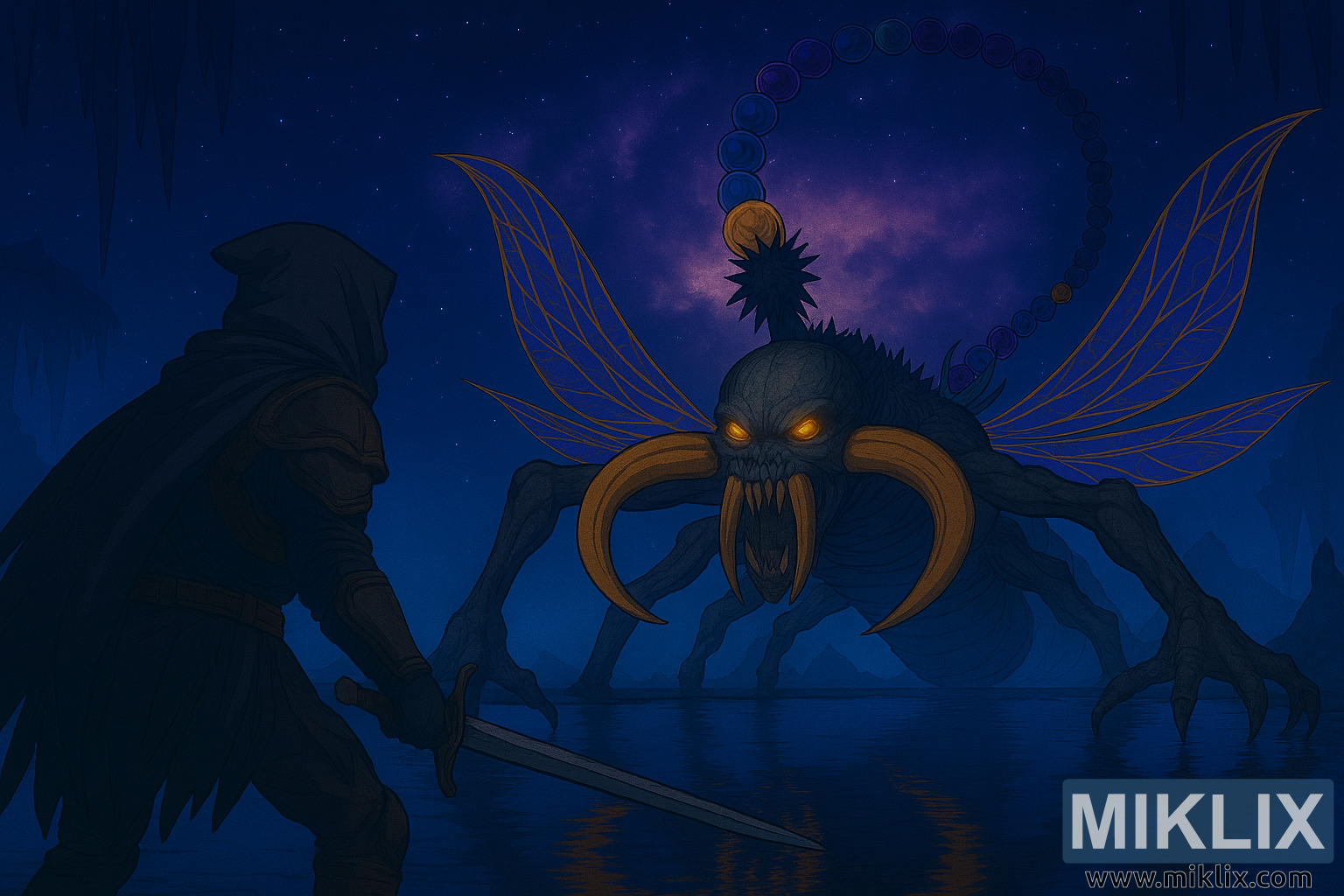 Sviðið gerist undir stjörnumiklum himni, með hvössum stalaktítum sem hanga úr hellisloftinu og hvirfilbyljandi vetrarbrautarþoku sem varpar fjólubláum og magenta litbrigðum yfir vatnsósa landslagið. Grunn neðanjarðaráin endurspeglar himneska bakgrunninn og verurnar í honum og eykur dulræna stemninguna.