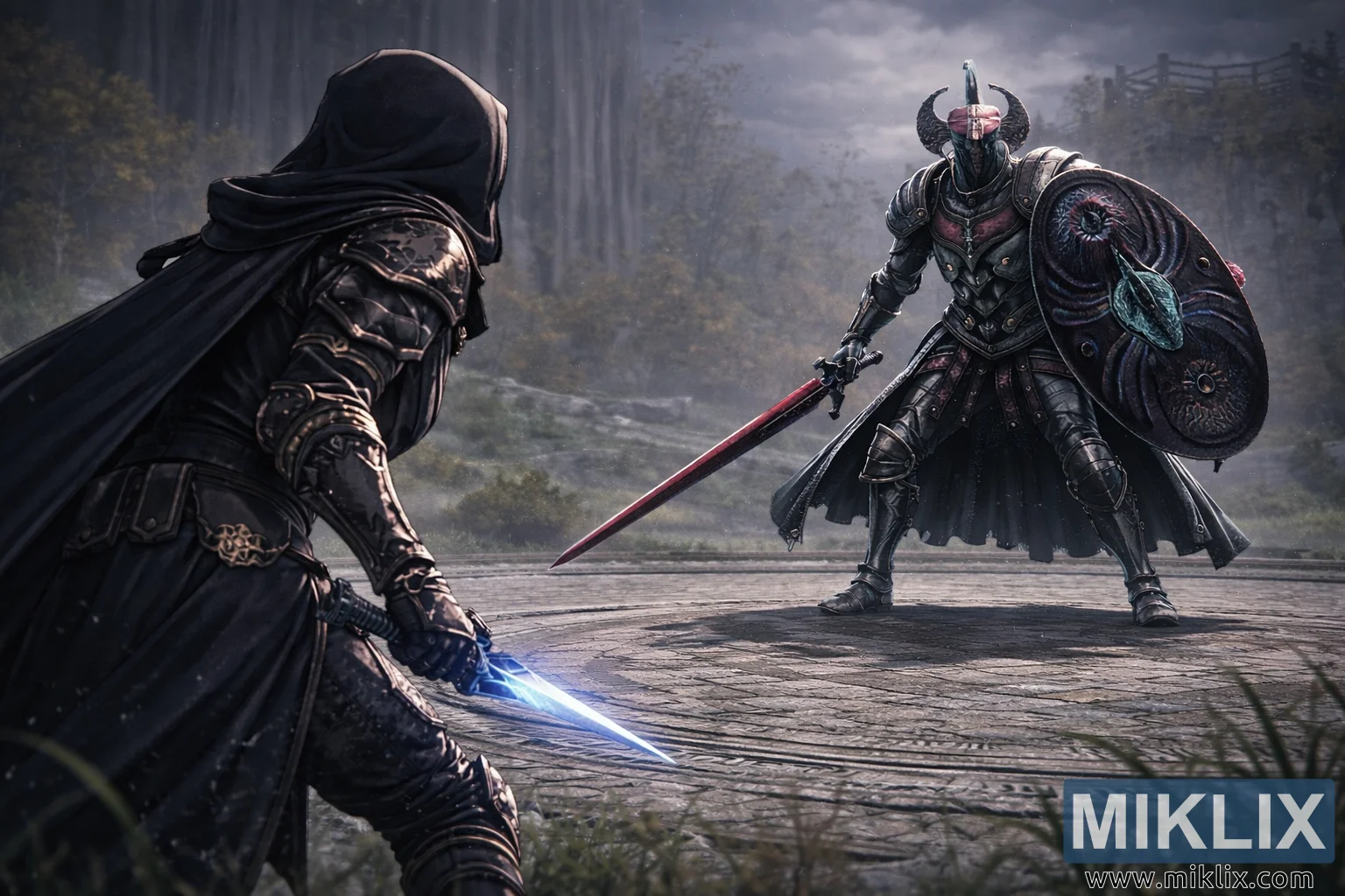 Í miðjunni og hægri hlið myndarinnar stendur Crucible Knight, töluvert stærri og þyngri að byggingu. Áberandi nærvera riddarans er styrkt af gríðarlegum, skrautlegum brynjum með þykkum plötum, lagskiptum hlutum og grafnum mynstrum sem gefa vísbendingu um fornan uppruna. Hornhúðaður hjálmur krýnir myndina og gefur henni grimmilega, næstum goðsagnakennda útlínu. Crucible Knight heldur á löngu sverði með daufum rauðum ljóma, sem hallar niður á við en er tilbúið til að ráðast hratt og eyðileggjandi. Í hinni hendinni er stór, kringlóttur skjöldur reistur til varnar, skreyttur með hvirfilbyljandi, lífrænum mynstrum og augnlíkum formum sem gefa honum óróandi, lifandi yfirbragð.