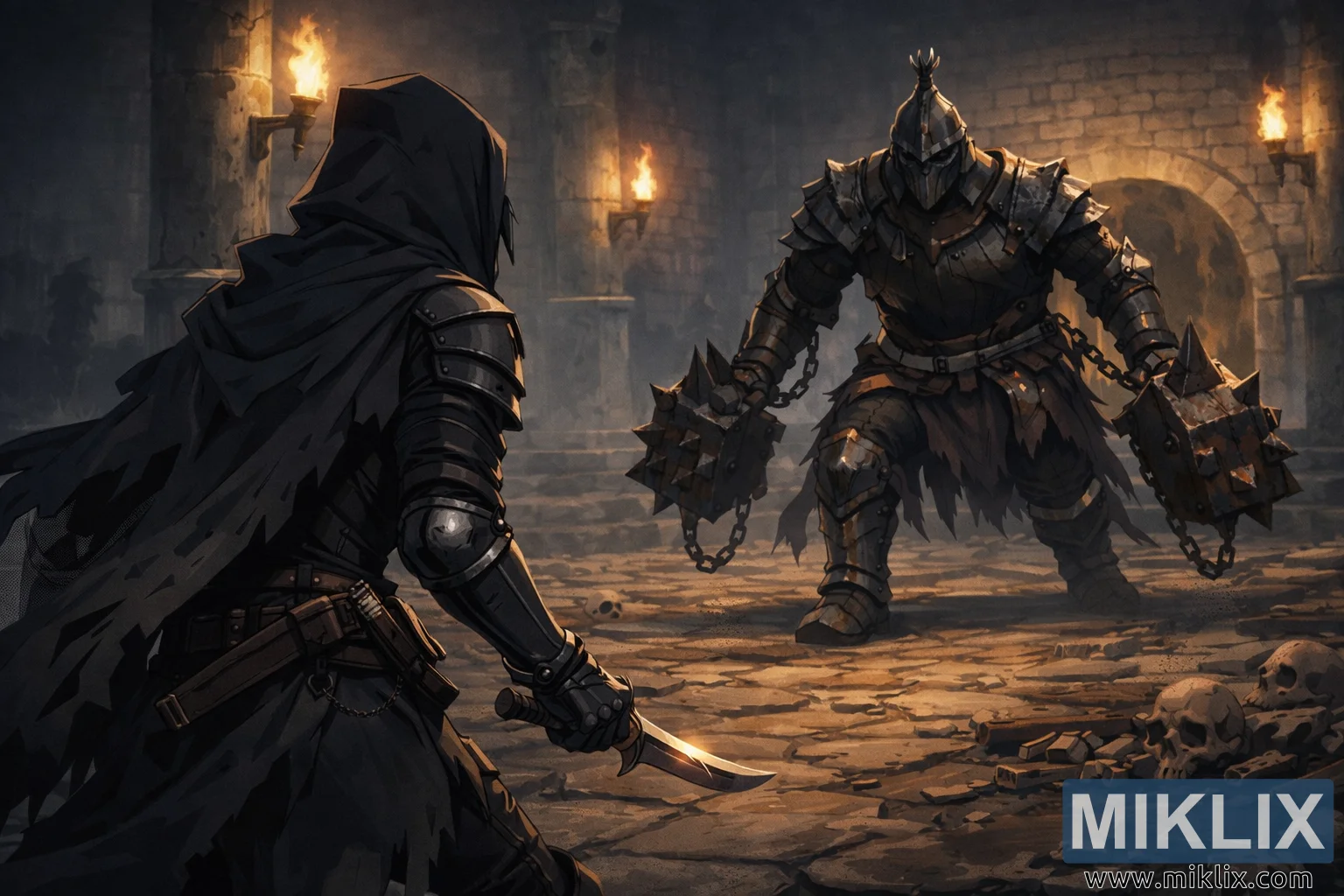 Á móti þeim frá hægri hlið herbergisins gnæfir Grafarvörðurinn, stórbrotinn og þungbrynjaður maður sem ræður ríkjum í miðjunni. Brynja einvígisins er þykk, ryðguð og ör, með skörðum brúnum og lagskiptum plötum sem leggja áherslu á hrottalegan styrk fram yfir glæsileika. Keðjur hanga á báðum handleggjum, hvor um sig festur við gríðarlega broddhamra sem virðast nógu þungir til að kremja stein. Málmfletirnir eru brotnir og slitnir, sem endurspeglar ára miskunnarlausa bardaga. Hjálmur einvígisins hylur andlit þeirra alveg, sviptir burt öll ummerki um mannúð og gefur yfirmanninum kalda, skrímslakennda nærveru. Þeir standa breið og jarðbundnir, fæturnir þétt í sundur, eins og þeir séu að búa sig undir sprengihleðslu eða eyðileggjandi sveiflu.
