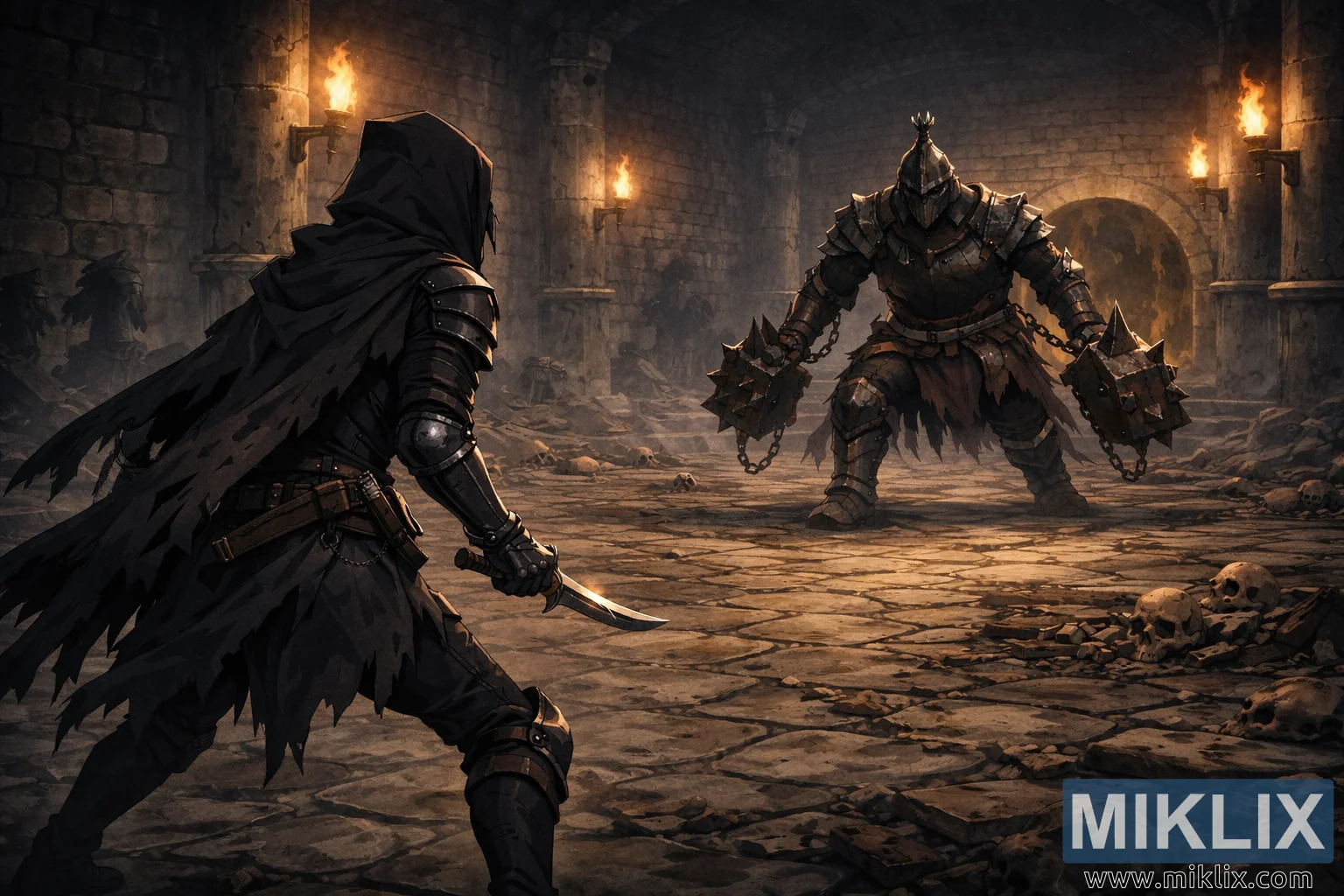 Hinumegin í herberginu, í hægri miðju, gnæfir grafarvörðurinn. Einvígismaðurinn er gríðarstór og þungbyggður, klæddur þykkri, slitinni brynju sem lítur bæði út fyrir að vera forn og grimmilega hagnýt. Málmurinn er ryðgaður og örvaður, með skörðum brúnum og lagskiptum plötum sem undirstrika hráan styrk. Þungar keðjur hanga frá báðum handleggjum, hvor um sig festur við risavaxna broddhamra sem næstum skafa jörðina. Vopnin virðast óbærilega þung, sem styrkir hlutverk einvígismannsins sem böðuls frekar en einvígismanns í nafni einu. Hjálmurinn hylur andlit einvígismannsins að fullu, afmáir öll merki um mannúð og gefur honum ógnvekjandi, ómannlega nærveru. Þeir standa breiðir og jarðbundnar, fæturnir þétt í sundur, eins og þeir væru búnir undir sprengihleðslu eða eyðileggjandi sveiflu.