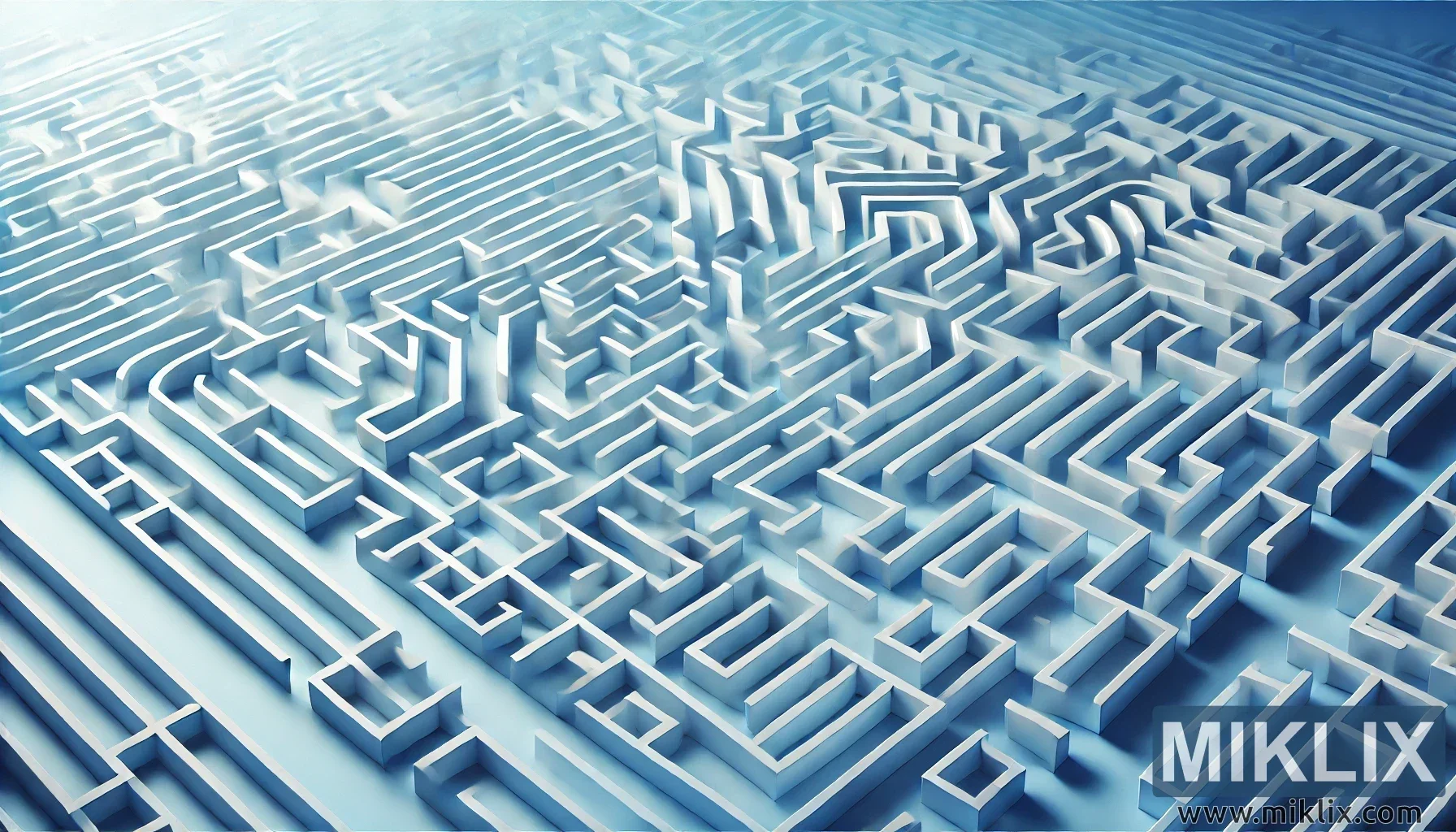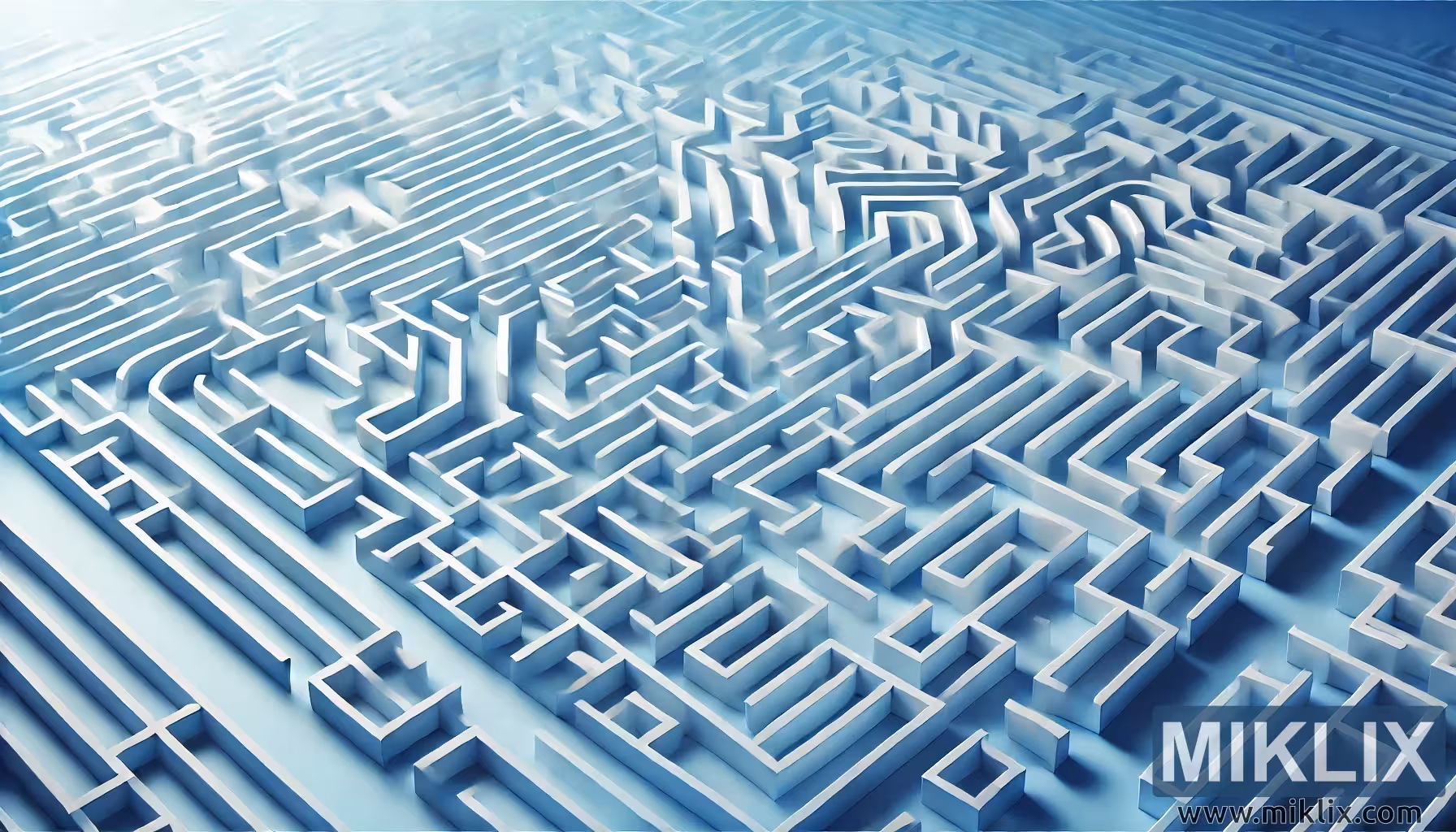 Þessi stafræna myndskreyting sýnir víðáttumikið og flókið völundarhús sem teygir sig yfir allan rammann og táknar flækjustig, lausn vandamála og könnun. Völundarhúsið er samsett úr háum, hvítum veggjum með skörpum rúmfræðilegum hornum sem varpa lúmskum skuggum sem auka þrívíddardýpt þess. Hönnunin einkennist af ótal slóðum, blindgötum og skörpum beygjum, sem vekja upp áskorunina við siglingar og leit að lausnum innan skipulagðra marka. Sjónarhorn myndarinnar hverfur út í fjarska og gefur til kynna endalausa víðáttu ganganna og valkosta, sem leggur áherslu á yfirþyrmandi eðli þrauta og ákvarðanatökuferla. Kalda bláa og hvíta litasamsetningin skapar rólegt en samt abstrakt andrúmsloft, sem styrkir hugmyndina um hugræna áskorun frekar en líkamlegt eða ógnandi umhverfi. Þetta völundarhús má túlka sem myndlíkingu fyrir hindranir lífsins, stefnumótandi hugsun eða tæknilega vandamálalausn, og fangar bæði gremju og aðdáun við að sigla í gegnum flókin kerfi.