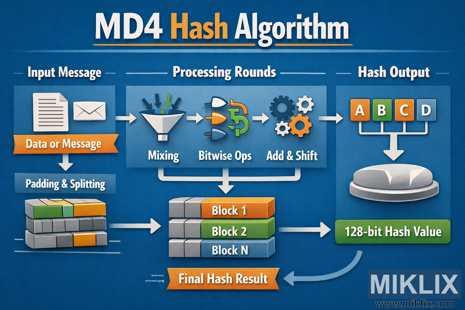 Ok, quindi pensate a MD4 come a uno speciale distruggidocumenti. Ma invece di distruggere la carta, "distrugge" qualsiasi messaggio (come una lettera, una password o un libro) in una piccola ricevuta di dimensioni fisse. Non importa quanto grande o piccolo sia il messaggio, questo distruggidocumenti vi restituisce sempre una minuscola ricevuta lunga esattamente 16 byte (128 bit), ovvero 32 caratteri in formato esadecimale.