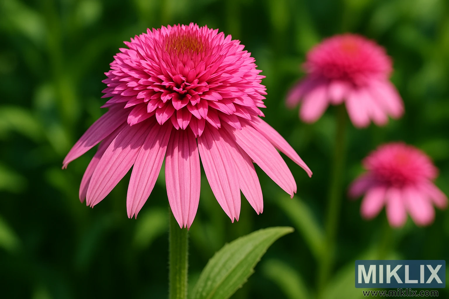 L'immagine presenta uno splendido primo piano di un'echinacea Butterfly Kisses (Echinacea purpurea 'Butterfly Kisses') in piena fioritura, catturando l'intricata bellezza e la forma distintiva di questa cultivar compatta a fiore doppio. Dominando il primo piano, il fiore centrale è reso con eccezionale chiarezza e dettaglio, mettendo in mostra la sua caratteristica struttura a "pompon": una densa cupola a ciuffo di petali stratificati che si erge fiera dal centro come una corona floreale. Ogni fiore di questo gruppo centrale è delicatamente modellato e disposto, formando una morbida massa sferica di toni rosa saturi che vanno dal rosa acceso alle punte al magenta più intenso verso la base.