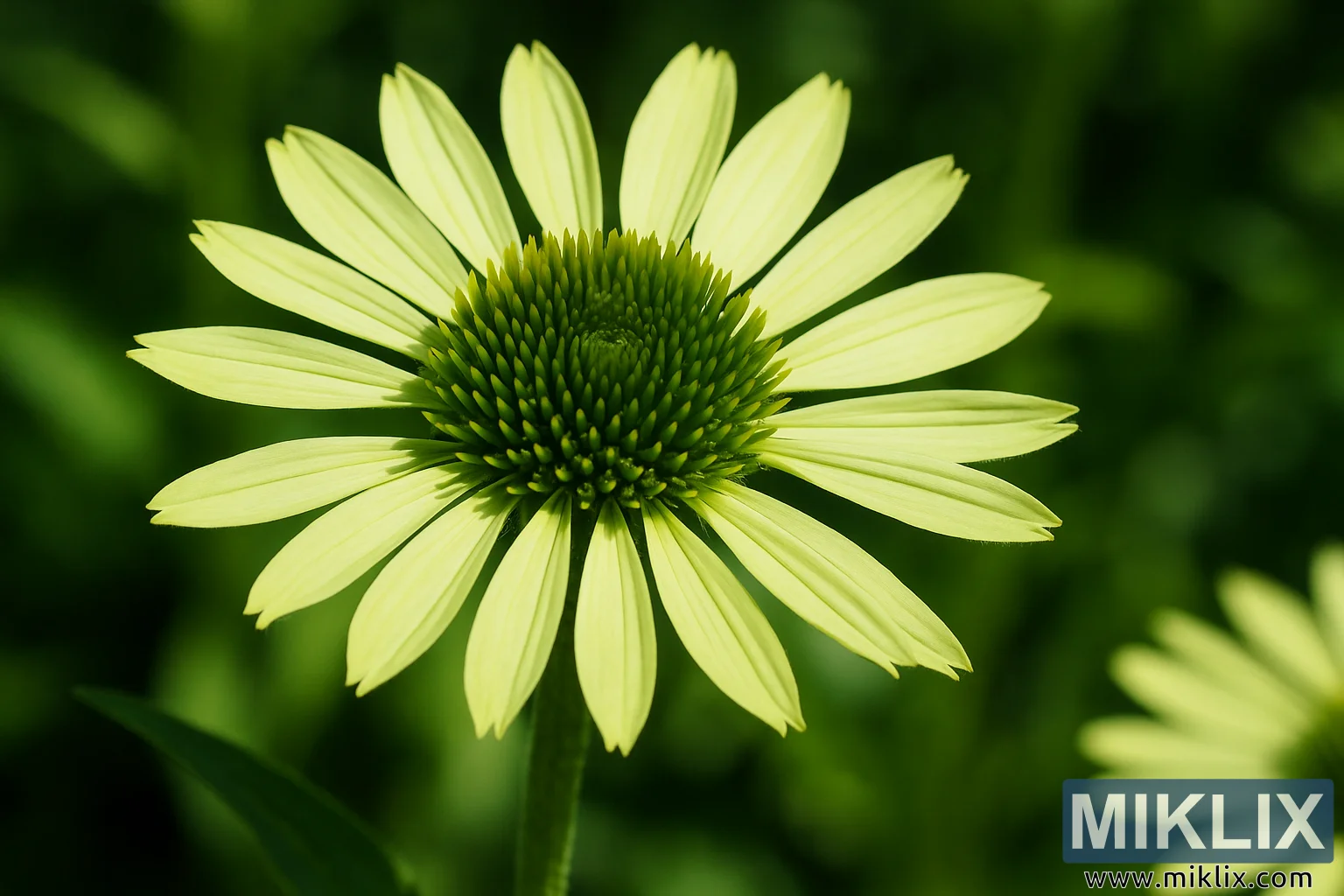 Primo piano dettagliato di un'echinacea Green Jewel con petali verde chiaro e un cono centrale verde scuro intenso, immortalato alla luce naturale del sole estivo.