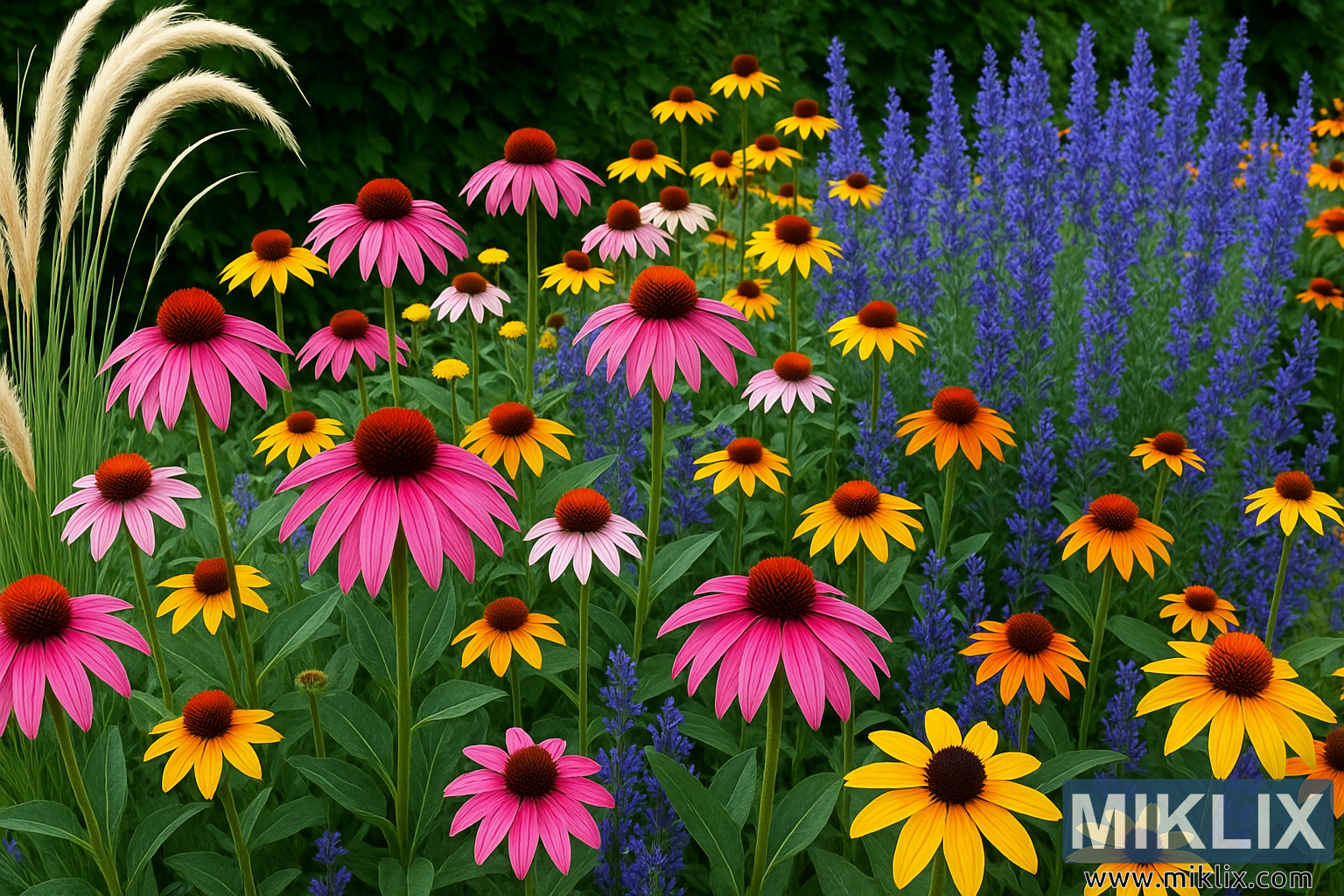Una luminosa ed esuberante bordura estiva riempie l'inquadratura, composta come un arazzo di colori e texture. In primo piano, maestosi echinacei (Echinacea) si ergono su steli robusti e dritti, con i loro capolini simili a margherite che si ergono fieri sopra un mare di fogliame verde. I petali spaziano in uno spettro vivace – rosa lampone, rosa tenue e toni violacei più intensi – ognuno disposto attorno a un cono a cupola color ruggine, irto di fiorellini fitti. I petali sono lunghi e leggermente arcuati, con una tenue venatura longitudinale che cattura la luce e conferisce loro una lucentezza setosa. Alcuni fiori sono completamente aperti e simmetrici; altri si stanno appena aprendo, con i petali ancora leggermente a coppa, il che aggiunge un piacevole ritmo di ripetizione e variazione in tutta la piantagione.
