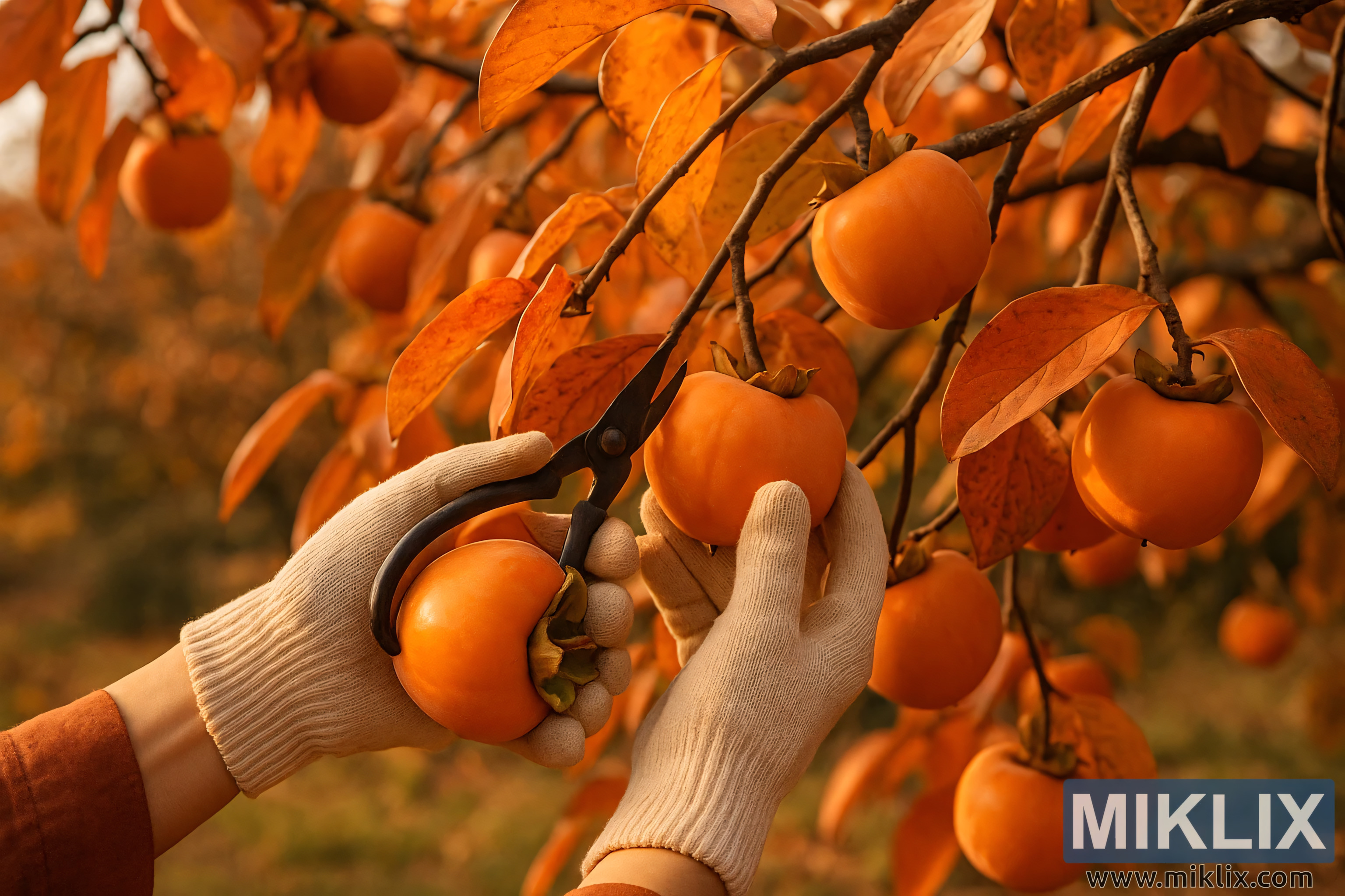 Harvesting Ripe Persimmons in the Warm Light of Autumn