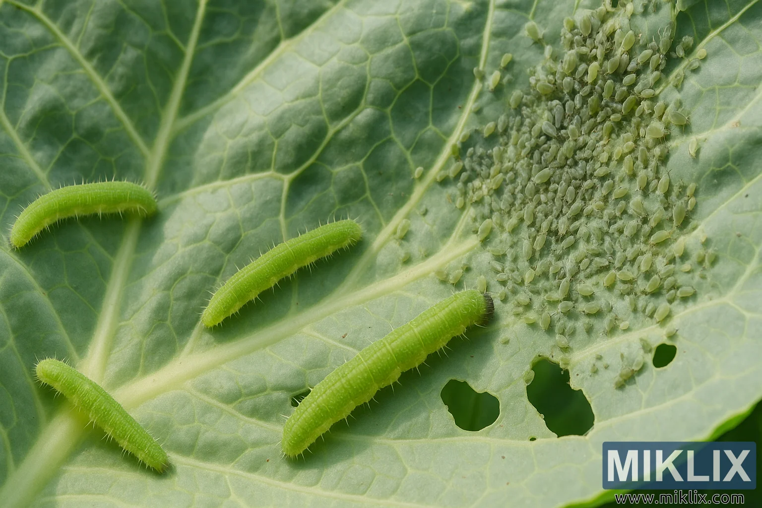 Primo piano dettagliato di una foglia di cavolo infestata da bruchi del cavolo e afidi, che mostra i parassiti comuni che danneggiano le piante di brassica.