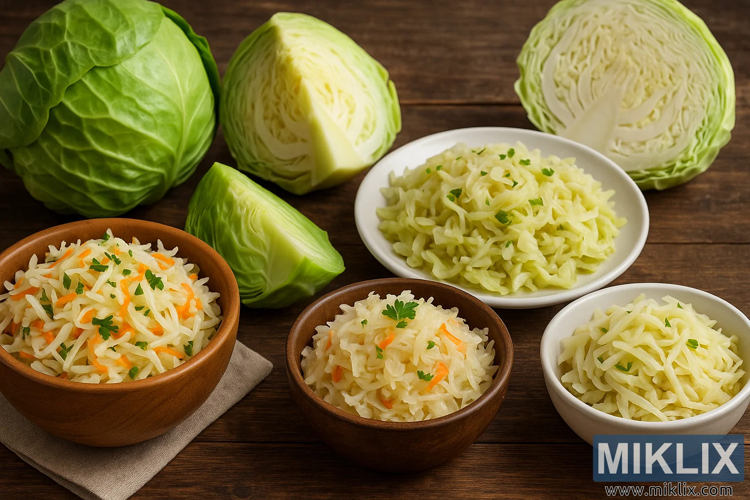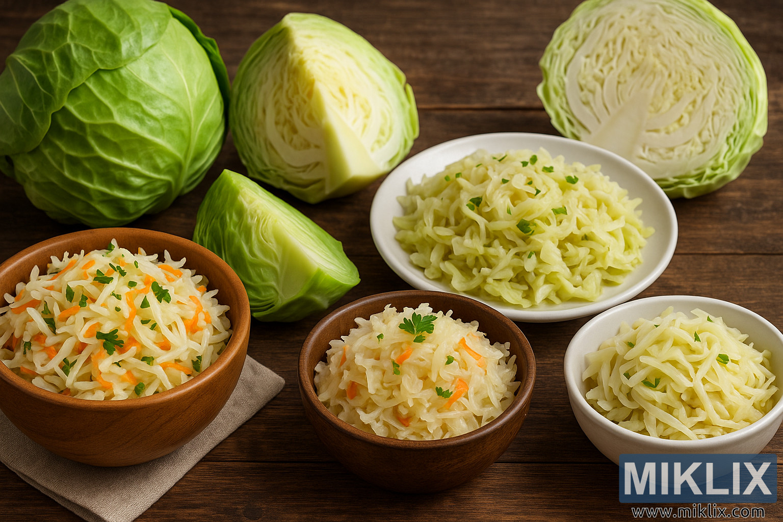 L'immagine presenta una fotografia ad alta risoluzione ricca di dettagli che ritrae un assortimento di piatti a base di cavolo verde fresco, disposti ad arte su un rustico tavolo di legno. In primo piano, diverse ciotole di preparazioni a base di cavolo tritato sono allineate ordinatamente, ognuna delle quali offre una distinta interpretazione di classici piatti a base di cavolo come l'insalata di cavolo e i crauti. La ciotola a sinistra contiene un vivace mix di cavolo tritato finemente e sottili striscioline di carota, leggermente guarnito con prezzemolo fresco, che conferisce al piatto un vivace contrasto di colore. Accanto, un'altra ciotola di legno contiene un mix di cavolo più cremoso e dall'aspetto leggermente più morbido – forse una versione delicata e leggermente fermentata dei crauti – anch'esso guarnito con un tocco di prezzemolo per dare luminosità. A destra, una ciotola di ceramica bianca liscia contiene una preparazione a base di cavolo più chiara e semplice, in lunghe e sottili striscioline, mantenendo un'estetica pulita e minimalista.
