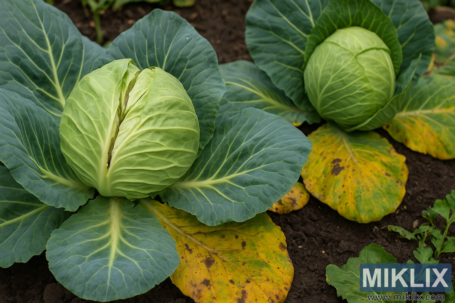 Nel complesso, l'immagine offre uno sguardo chiaro e dettagliato a due delle sfide più riconoscibili nella coltivazione del cavolo: la spaccatura delle teste causata da bruschi cambiamenti di crescita e l'ingiallimento delle foglie esterne causato da stress nutrizionale, squilibrio di umidità o invecchiamento naturale. La combinazione di verdi vivaci, toni gialli caldi e le texture organiche del terreno e del fogliame crea un'immagine realistica e informativa dal punto di vista orticolo, che evidenzia sia la resilienza che le vulnerabilità del cavolo durante la maturazione in un ambiente domestico.
