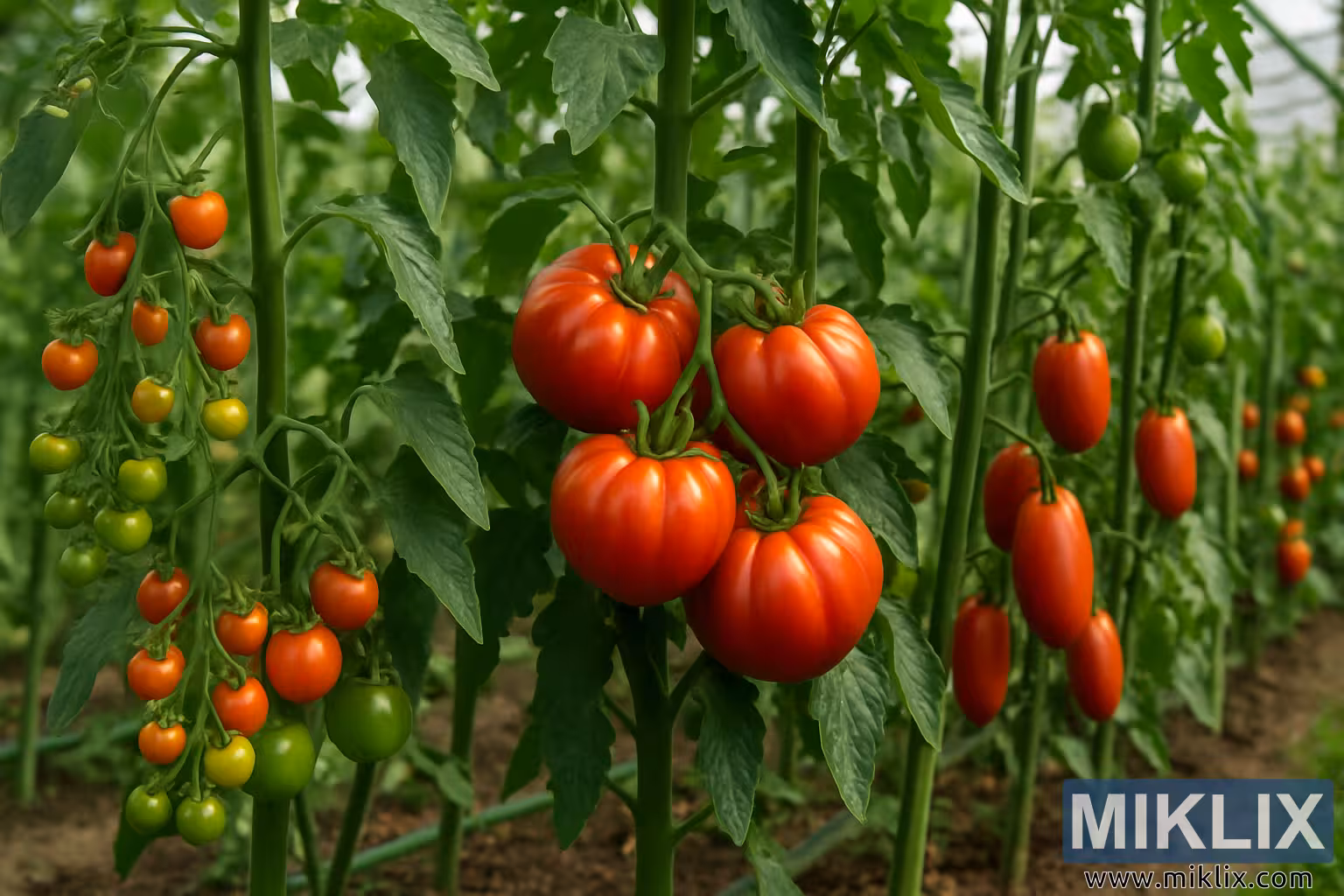 Una vista dettagliata delle piante di pomodoro che crescono in una serra, con varietà di pomodori ciliegia, beefsteak e roma in vari stadi di maturazione.