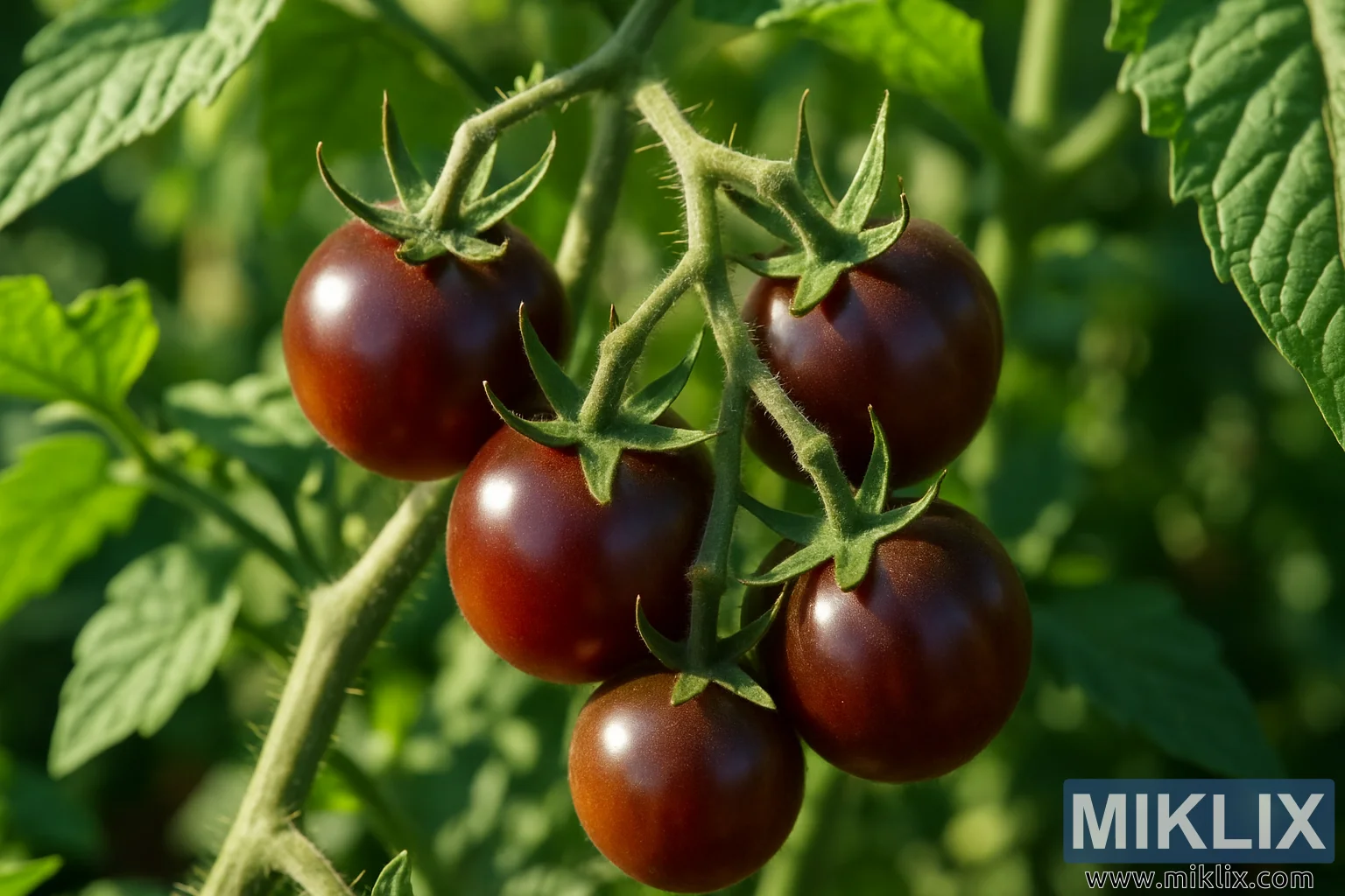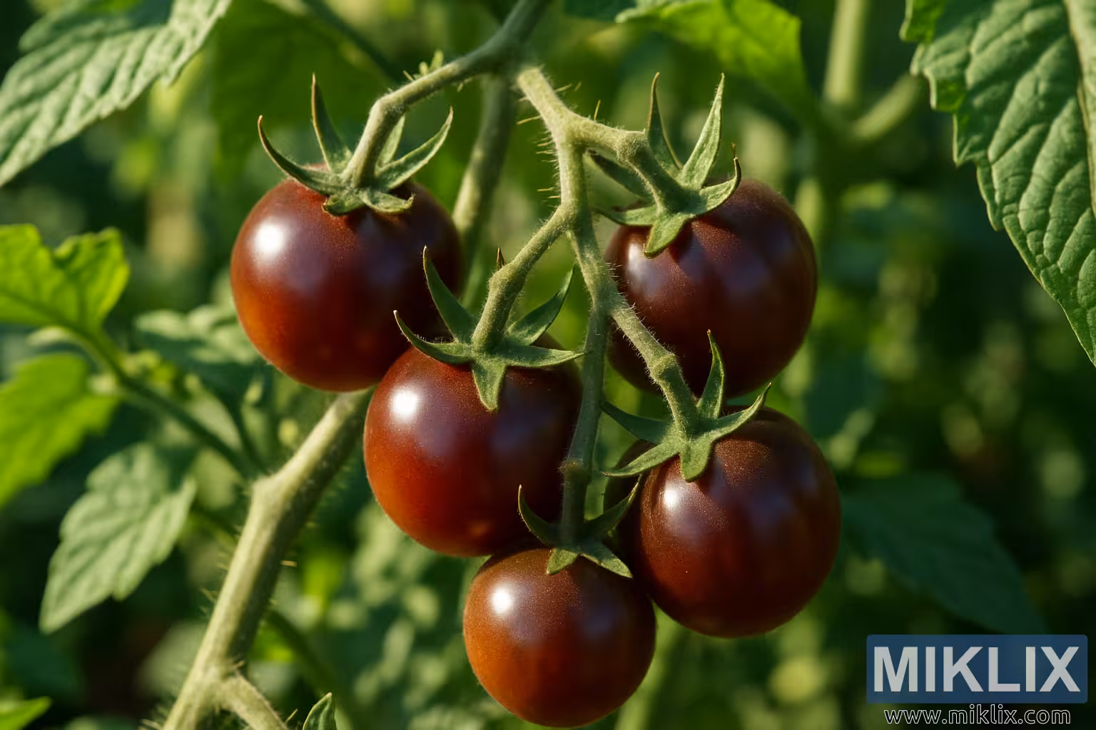 Un primo piano dettagliato di pomodori ciliegini neri maturi sulla pianta, illuminati dalla luce solare intensa e circondati da un fogliame verde brillante.